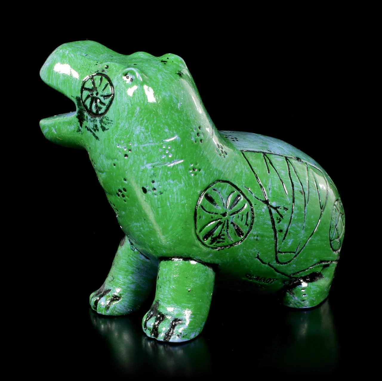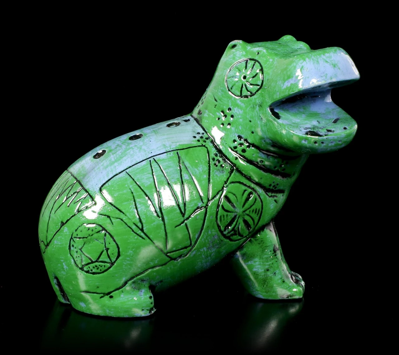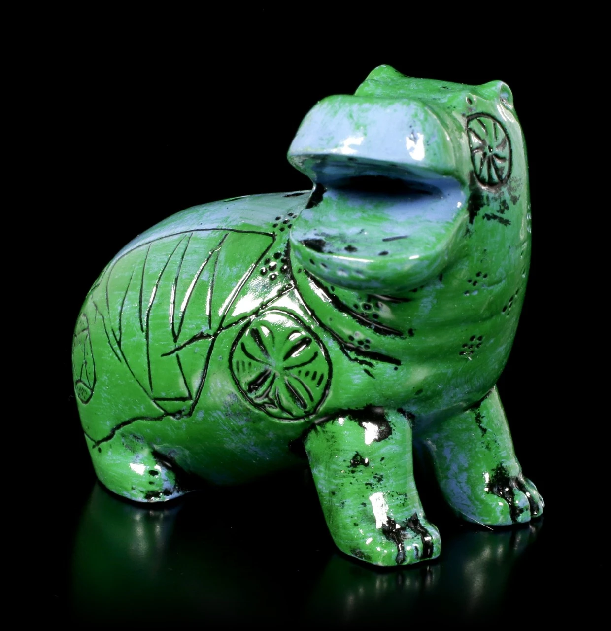 Diese tolle Figur eines ägyptischen Nilpferds aus der Serie Ancient Egypt ist aus handbemaltem Kunststein (Polyresin) und wurde mit glasiertem blau grünem Finish überzogene. Überall in den alten ägyptischen archäologischen Stätten wurden Tierkeramikstücke gefunden. Diese Nachbildung ist eine großartige Ergänzung der Sammlung eines jeden Ägypten Fans. Das Nilpferd gehört zu den am häufigsten gefundenen Ikonen.