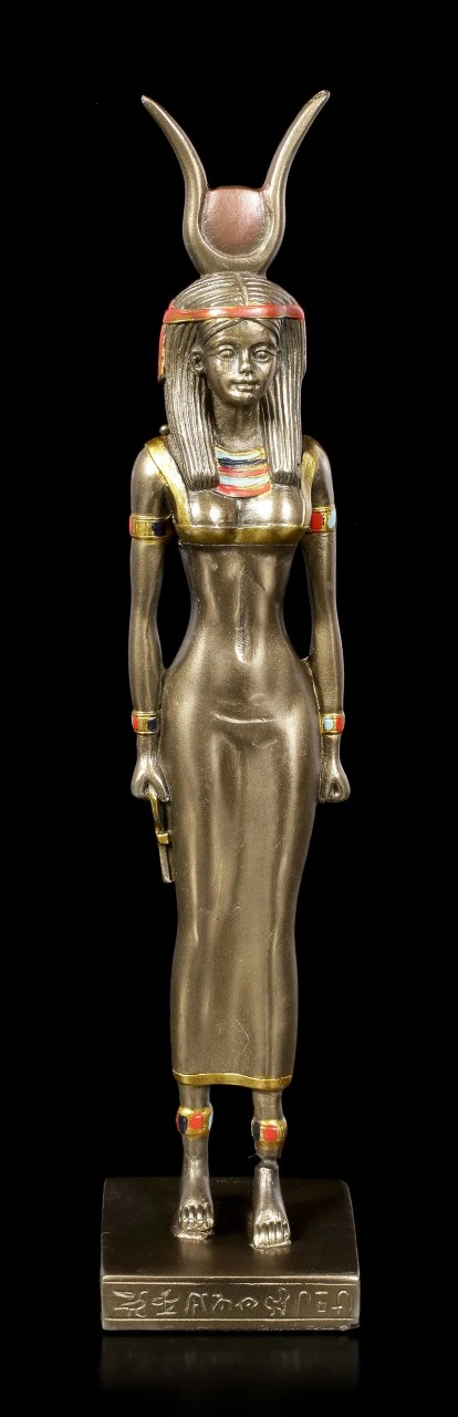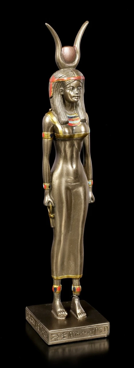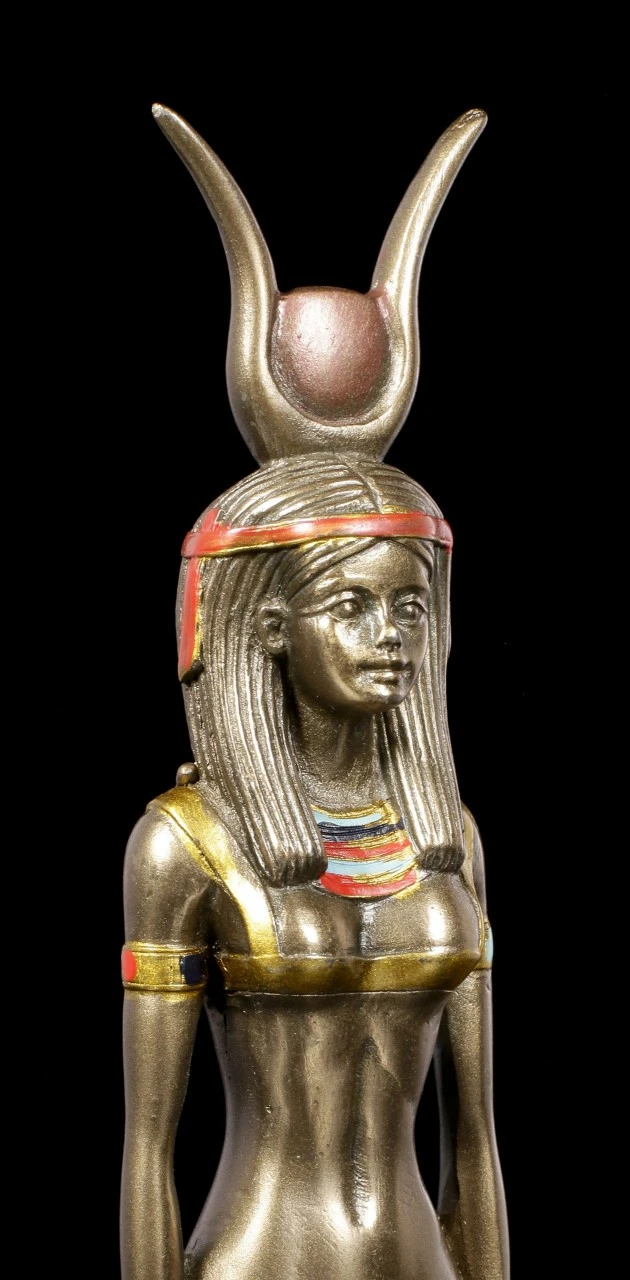 Diese bronzierte und colorierte Kunststein (Polyresin) Statue aus der Serie Ancient Egypt zeigt die antike ägyptische Gottheit Isis. Isis ist hier mit der Sonnenscheibe und einem Kopfschmuck mit Kuhhörnern dargestellt. Sie war eine der am meisten verehrten Götter des alten Ägypten und steht für das Totenreich.
