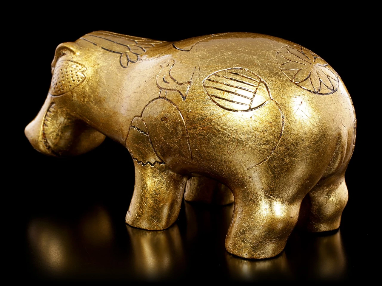 Angelehnt an die ägyptische Grabbeilage aus Mair, dem Fayence-Nilpferd Hippopotamus William, ist diese umwerfende Nilpferd Figur aus handbemaltem Kunststein entstanden. Das mit foralen Muster verzierte, goldfarbene Tier ist as der Serie Ancient Egypt.