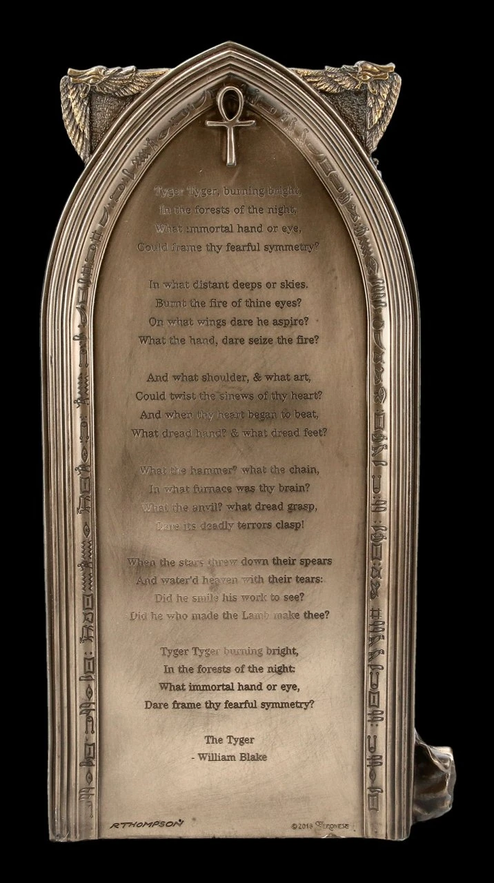 Aus der Fantasie der bekannten Künstlerin Ruth Thompson stammt diese schöne Priesterin aus dem alten Ägypten. An der Seite der schönen Priesterin mit dem ägyptischen Kopfschmuck, dem detailreichen Kragen und Schmuck und dem seidig glänzenden transparenten Rock, sitzt friedlich ein großer Löwe. Hinter ihrer Schulter ist ein Adler zu sehen und auf ihrem rechten Arm sitzt eine Katze. Auf der Rückseite des Tores, vor dem die Priesterin steht, ist das Gedicht ‚The Tyger‘ von William Blake zu lesen. Die schöne Statuette von Veronese ist aus edel bronziertem und wunderschön coloriertem Kunststein (Polyresin) gefertigt und hat eine Höhe von 26,5 cm, eine Breite von 13,5 cm und eine Tiefe von 7,5 cm. Für alle, die von der ägyptischen Kultur fasziniert sind, ist diese schöne Priesterin eine wunderbare Deko und ein toller Blickfang in jedem Raum.