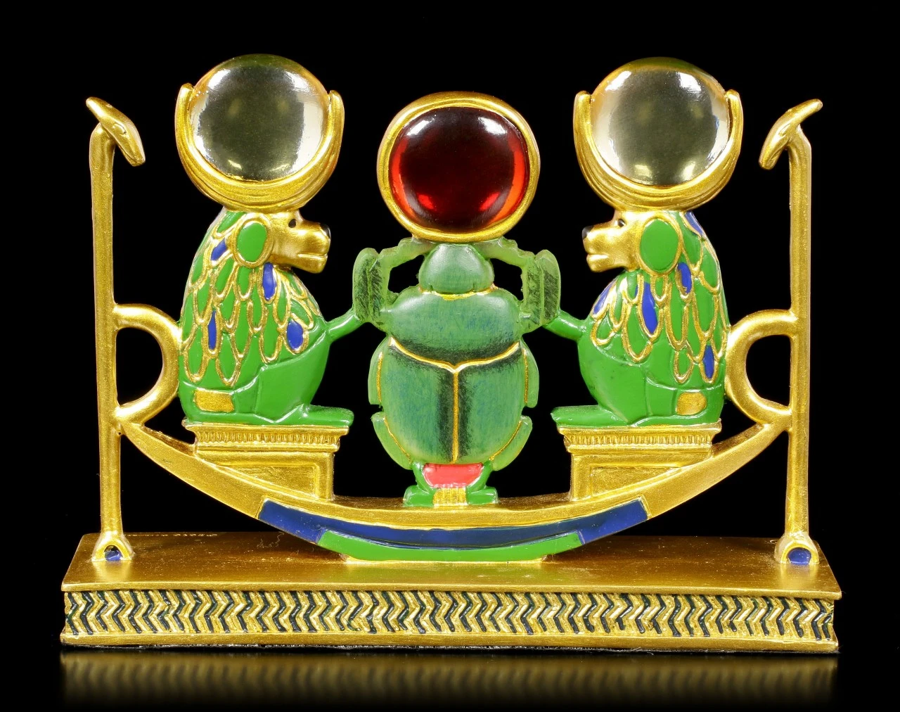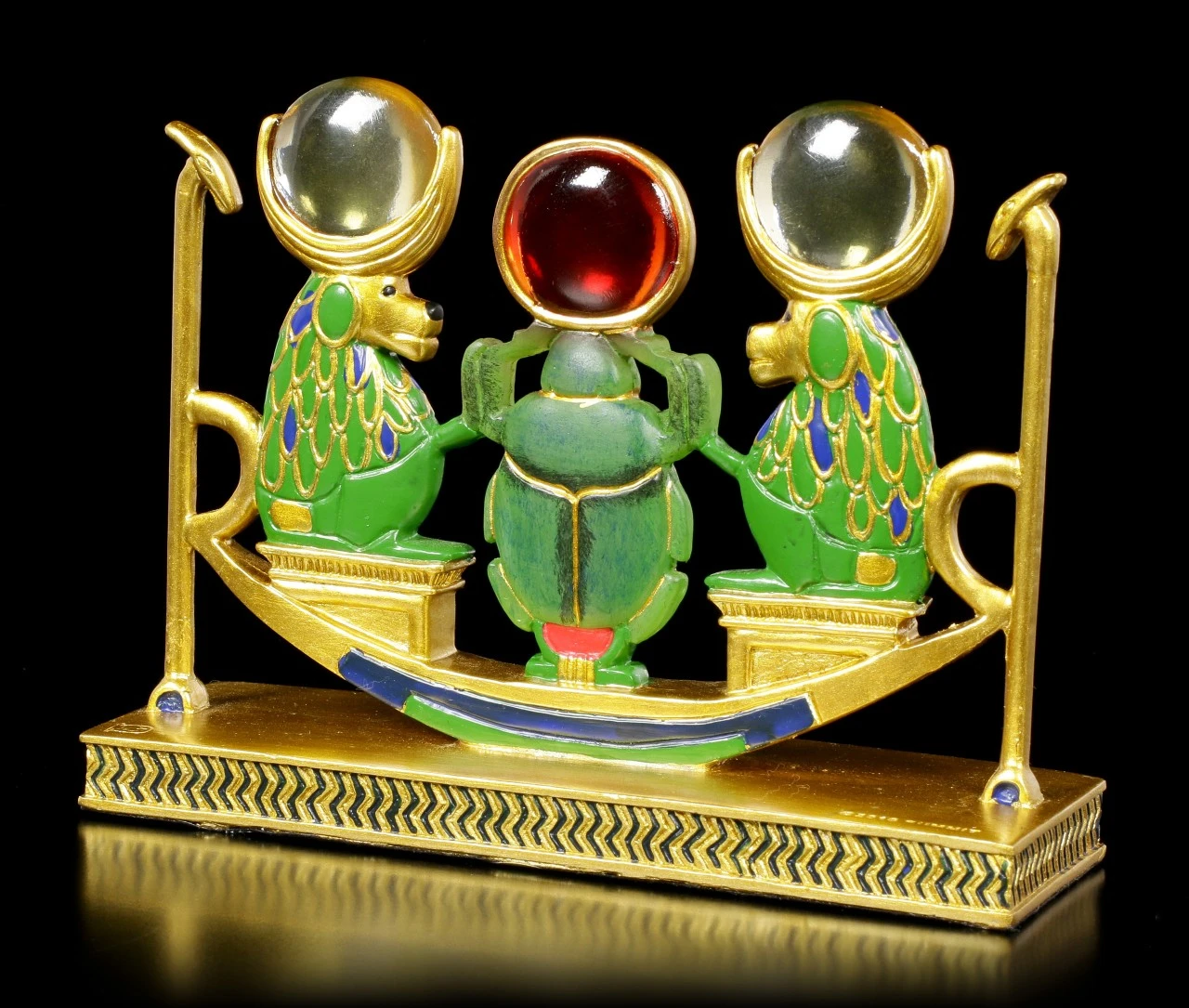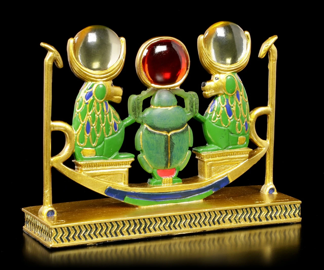 Aus der Serie Ancient Egypt ist diese tolle ägyptische Figur aus handbemaltem Kunststein (Polyresin). Das umwerfende Design besticht genauso wie die tollen Farben. Die beiden Affen sitzen links und rechts neben einem Skarabäus. Zusammen sind sie auf einer ägyptischen Barke. Alle drei haben die Sonnenscheibe auf ihrem Kopf – die Affen aus einem klaren durchsichtigen Resin Stein und der Skarabäus in Rot.