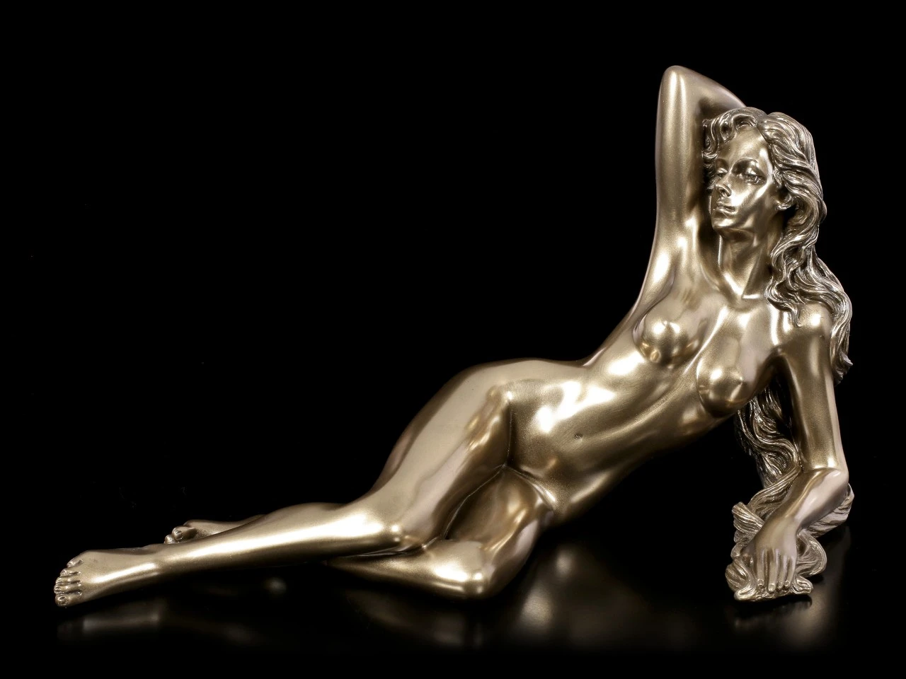 Lasziv räkelt sich die schlanke Schönheit auf den Laken. Sie hat eine Hand in ihrem langen, welligen Haar vergraben und die Augen geschlossen. Die wunderbar erotische und edel bronzierte weibliche Akt Figur aus hochwertigem Kunststein (Polyresin) ist von Veronese und aus der Studio Collection.