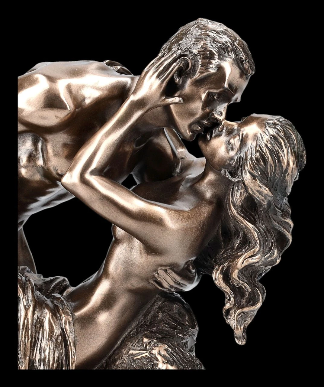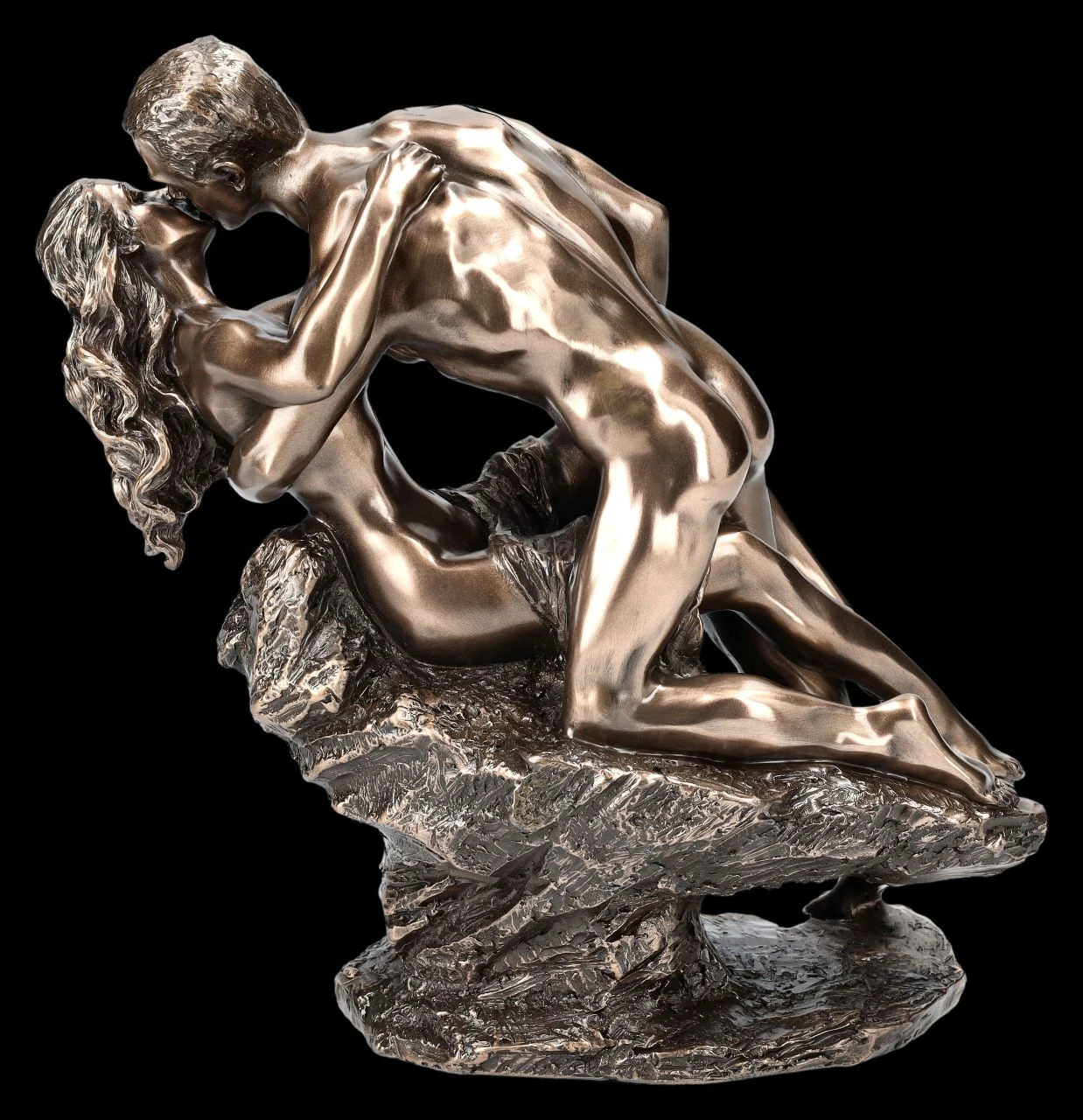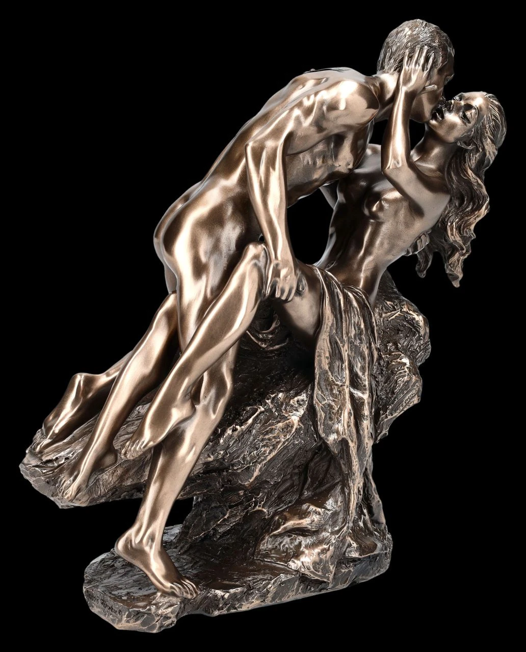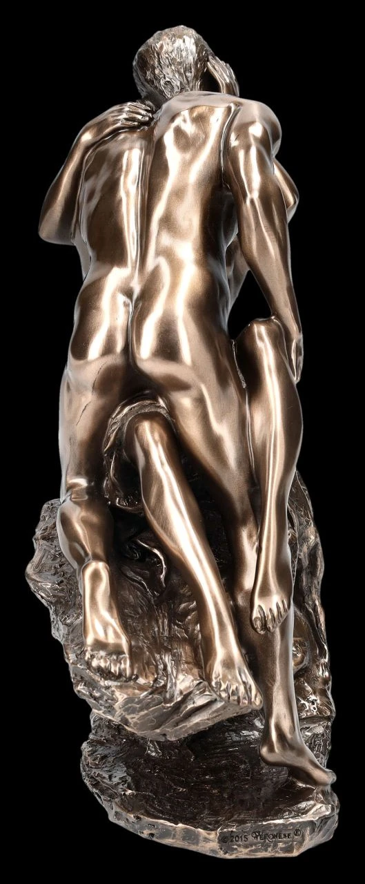 Der berühmte französische Künstler und Bildhauer Auguste Rodin zeigte in seiner Skulpturengruppe ‚Das ewige Idol‘ sich küssende eng umschlungene Liebespaare. Anders als bei Rodin beugt sich die Frau bei dieser leidenschaftlichen Akt-Figur von Veronese kurz vor dem Liebesakt zurück, um bereitwillig den Kuss des Mannes zu empfangen. So geben sich, anders als bei Rodin, der eher die Dominanz der Frau demonstrieren wollte, bei dieser wunderbaren Skulptur Mann und Frau gleichberechtigt ihrer Leidenschaft hin. Mit dem Titel ‚Love in Spring‘ soll diese kleine Skulptur aber vielleicht auch den Beginn einer großen Leidenschaft im Frühling des Lebens darstellen. Die wunderschöne erotische Skulptur ‚Love in Spring‘ aus der Studio Collection strahlt sehr facettenreich Sinnlichkeit, Liebe und Leidenschaft aus. Aus edel bronziertem Kunststein (Polyresin) gefertigt, ist diese wunderbare 20 cm hohe, 19,5 cm breite und 8,5 cm tiefe Akt-Figur der Liebenden ein effektvoller und sehr stilvoller Blickfang in jedem Ambiente und ein wunderbares Geschenk für den oder die Liebste.
