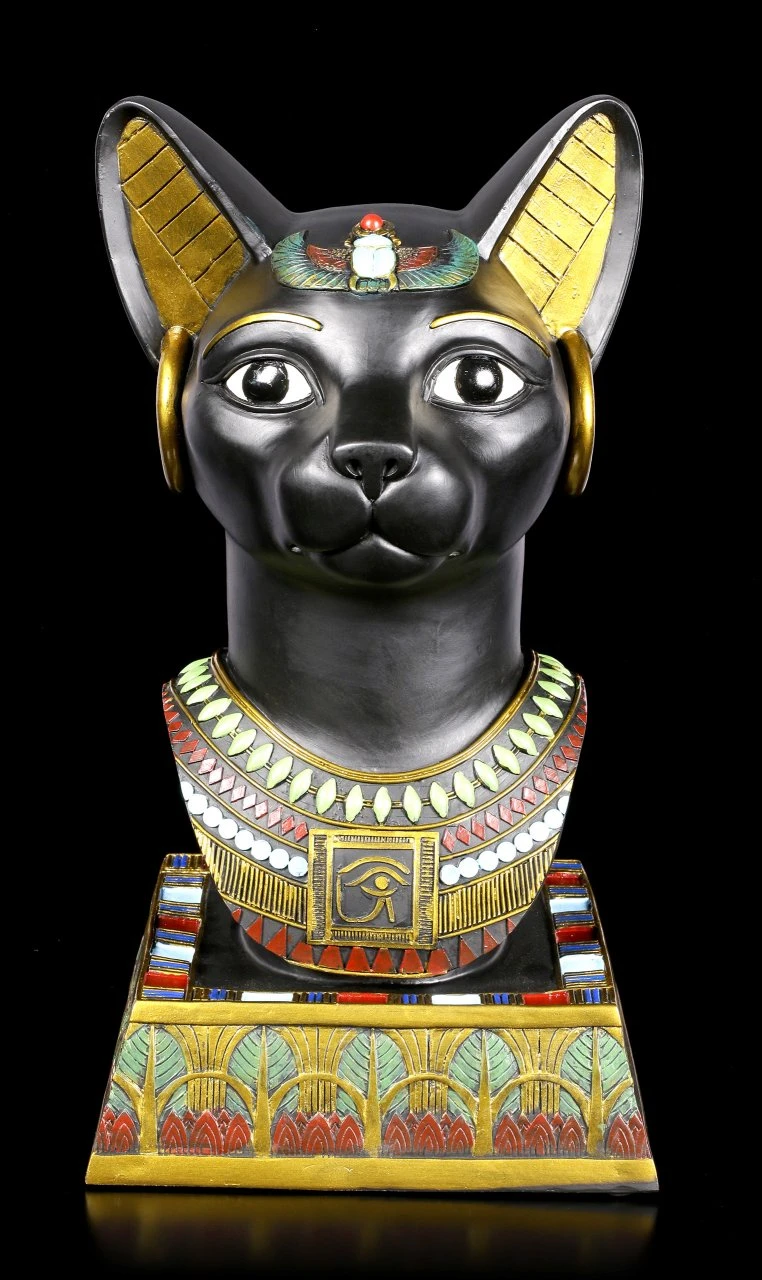 Die umwerfende 42 cm hohe, 23 cm breite und 23 cm tiefe Bastet Büste ist eine wundervolle Dekoration auf einem Sideboard oder Schreibtisch. Die farbenprächtige Katzenkopf Büste zeigt Bastet, die Tochter des Sonnengottes Re als Göttin der Fruchtbarkeit, aber auch der Freude, der Musik und des Tanzes aus der altägyptischen Mythologie. Die wunderbare Büste auf dem verzierten Podest ist aus hochwertigem Kunststein (Polyresin) gefertigt und wurde liebevoll farbenprächtig handbemalt. Die edle Büste ist wirklich ein Highlight in jedem Ambiente und ein perfektes Geschenk für jeden, der von der altägyptischen Mythologie fasziniert ist.