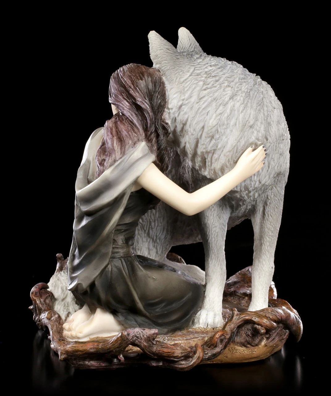 Die geheimnisvolle Dame schmiegt sich vertrauensvoll an ihrem Seelenverwandten, einen majestätischen Wolf. Die bekannte Künstlerin Anne Stokes schuf diese wunderschöne Figurenkomposition. Ein Zeichen für die innige Freundschaft die zwischen Mensch und Tier bestehen kann. Die Wolf Figur ‚Soul Bond‘ wurde aus hochwertigem Kunststein bis ins kleinste Detail ausgearbeitet und liebevoll handbemalt. Sie kommt in einer schönen Geschenkbox.