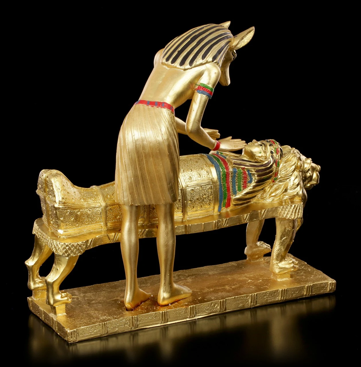 Diese wunderschön detailreiche Figurenkomposition ist eine elegante Nachbildung eines alt ägyptischen Wandgemäldes, das bei vielen altägyptischen Gräbern gefunden worden ist. Es zeigt Anubis bei der Mumifizierung eines verstorbenen Körpers. Die Mumifizierung war eine wichtige und heilige Zermemonie, die sofort nacht dem Tot durchgeführt wurde. Nur so konnte die Seele im Jenseits mit ihren Körper das irdische Leben wieder fortsetzen.
