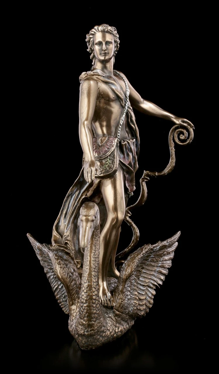 Diese elegante bronzierte Kunststein wurde dezent coloriert und stellt den römischen und auch griechischen Gott Apollo dar. Apollo ist der Gott des Frühlings, des Lichts, der sittlichen Reinheit und Mäßigung sowie der Weissagung. Auch werden ihm die Künste zugesprochen, insbesondere der Musik, der Dichtkunst und des Gesangs. Außerdem war Apollo Gott der Heilkunst und der Bogenschützen. Apollo ist der Zwillingsbruder von Artemis. Der Schwan in dieser Darstellung stellt Kyknos, Apollos Sohn dar.