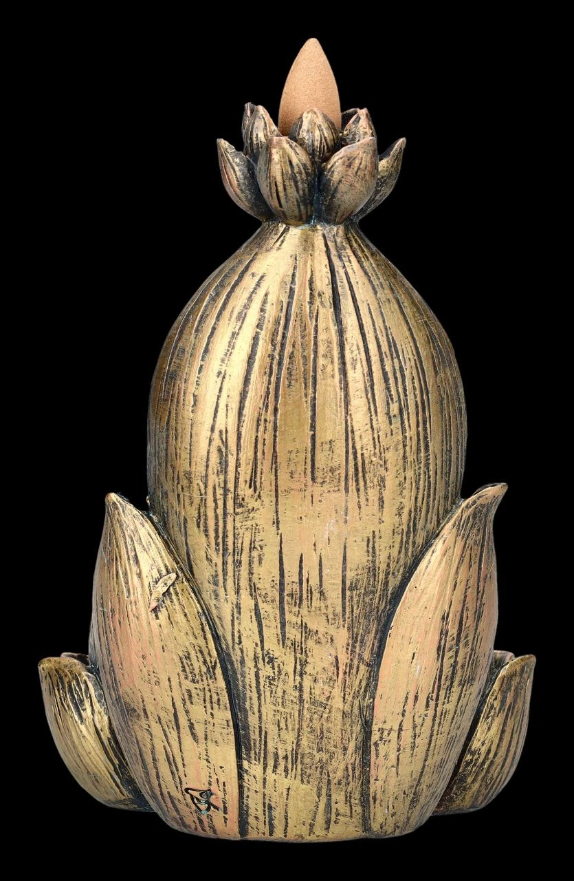 Der elefantenköpfige Gott Ganesha ist überaus beliebt, da er als Gott der Weisheit, der Wissenschaften und der Künste gilt. Außerdem steht er für die Überwindung von Hindernissen, für die Anfangsenergie und einen guten Beginn, aber auch für das Geniessen der schönen Aspekte des Lebens. Der Backflow-Räucherhalter mit dem auf einem Lotusblüten-Thron sitzenden Gott Ganesha unterstreicht die meditative Wirkung des Duftes von Backflow-Räucherkegeln. Der 18,5 cm hohe, 13,5 cm breite und 13 cm tiefe Backflow Räucherkegelhalter mit Ganesha wurde detailreich aus handbemaltem Kunststein (Polyresin) gefertigt. Die Lieferung erfolgt ohne Backflow-Räucherkegel, die jedoch in zahlreichen Duftrichtungen in unserem Shop zu finden sind. Bitte beachten Sie unsere Sicherheitshinweise.