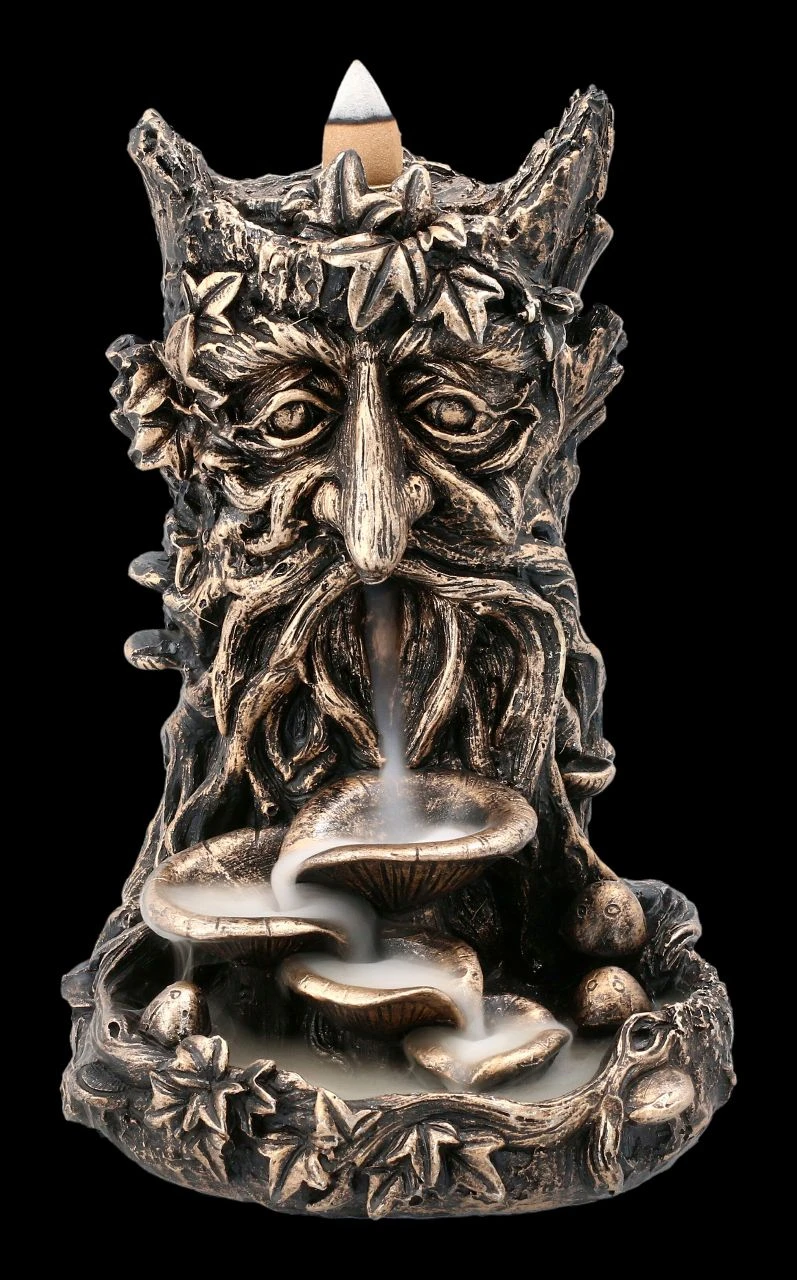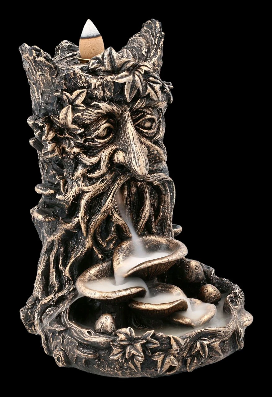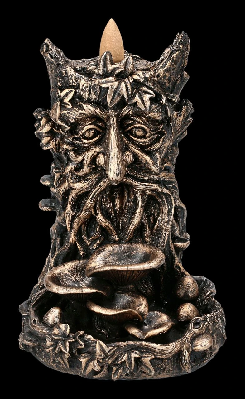 Als Lichtwesen verkörpert der Greenman die Harmonie von Geist und Natur. Also ist der Greenman auch die perfekte Symbolfigur für alle, die sich für den nachhaltigen Umgang und den Schutz unserer Erde einsetzen. Der 17 cm hohe, 12 cm breite und 13 cm tiefe Backflow Räucherhalter mit dem Greenman ist detailreich aus bronzefarben handbemaltem Kunststein (Polyresin) gefertigt. Dieser Backflow Räucherhalter ist auch ein wunderbares Geschenk. 3 Backflow Räucherkegel sind inklusive, weitere finden Sie in unserem Shop. Beachten Sie aber bitte unbedingt die Sciherheitshinweise zu unseren Backflow Räucherhaltern.