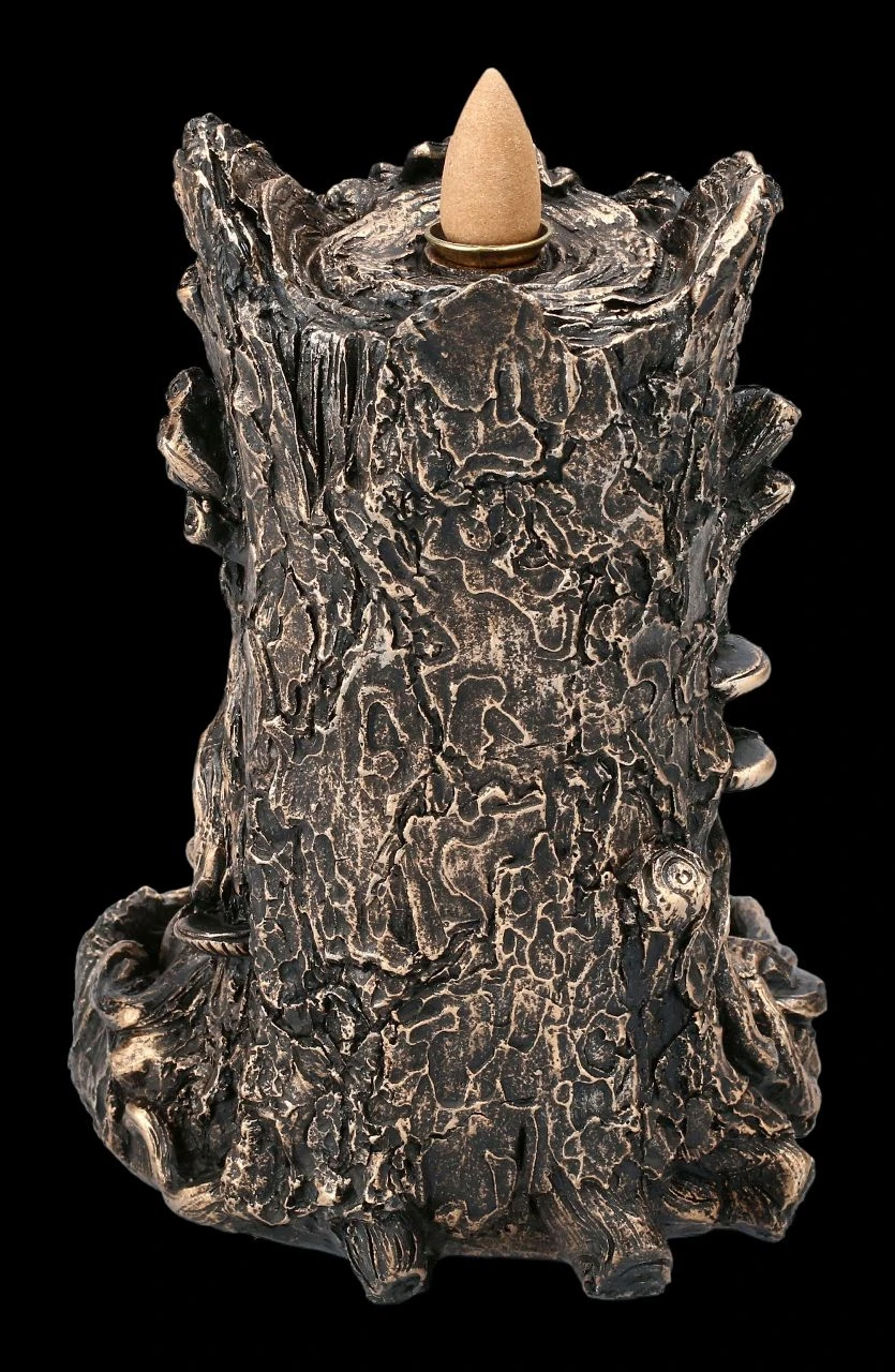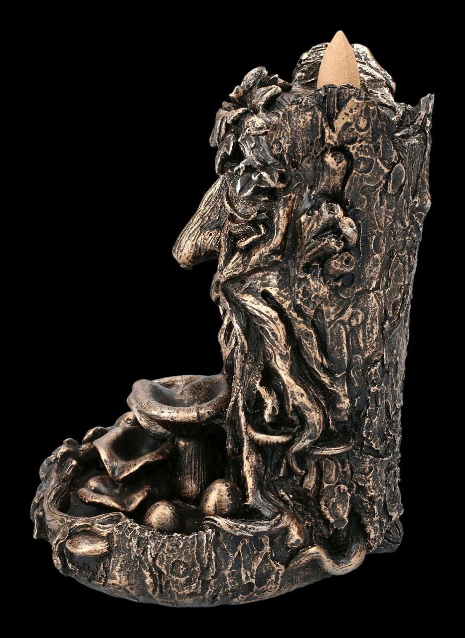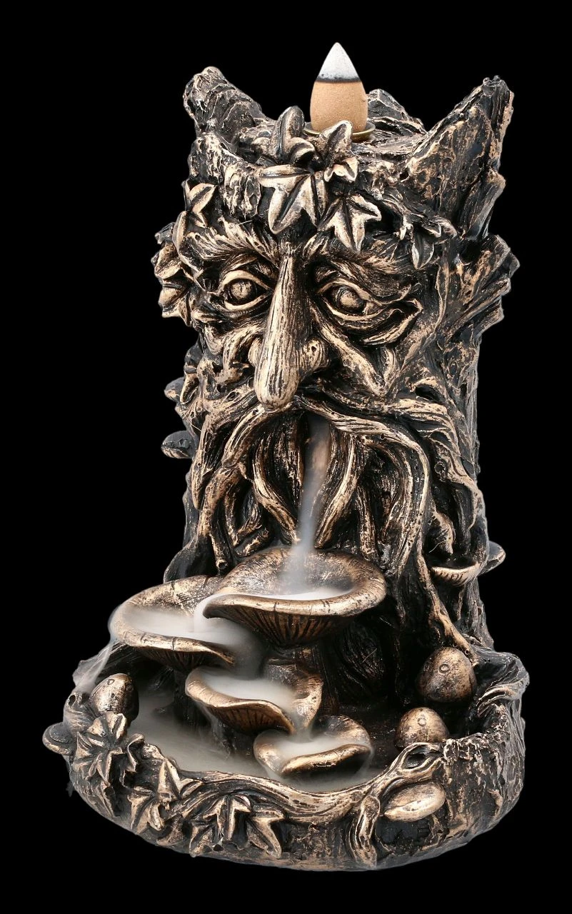 Als Lichtwesen verkörpert der Greenman die Harmonie von Geist und Natur. Also ist der Greenman auch die perfekte Symbolfigur für alle, die sich für den nachhaltigen Umgang und den Schutz unserer Erde einsetzen. Der 17 cm hohe, 12 cm breite und 13 cm tiefe Backflow Räucherhalter mit dem Greenman ist detailreich aus bronzefarben handbemaltem Kunststein (Polyresin) gefertigt. Dieser Backflow Räucherhalter ist auch ein wunderbares Geschenk. 3 Backflow Räucherkegel sind inklusive, weitere finden Sie in unserem Shop. Beachten Sie aber bitte unbedingt die Sciherheitshinweise zu unseren Backflow Räucherhaltern.