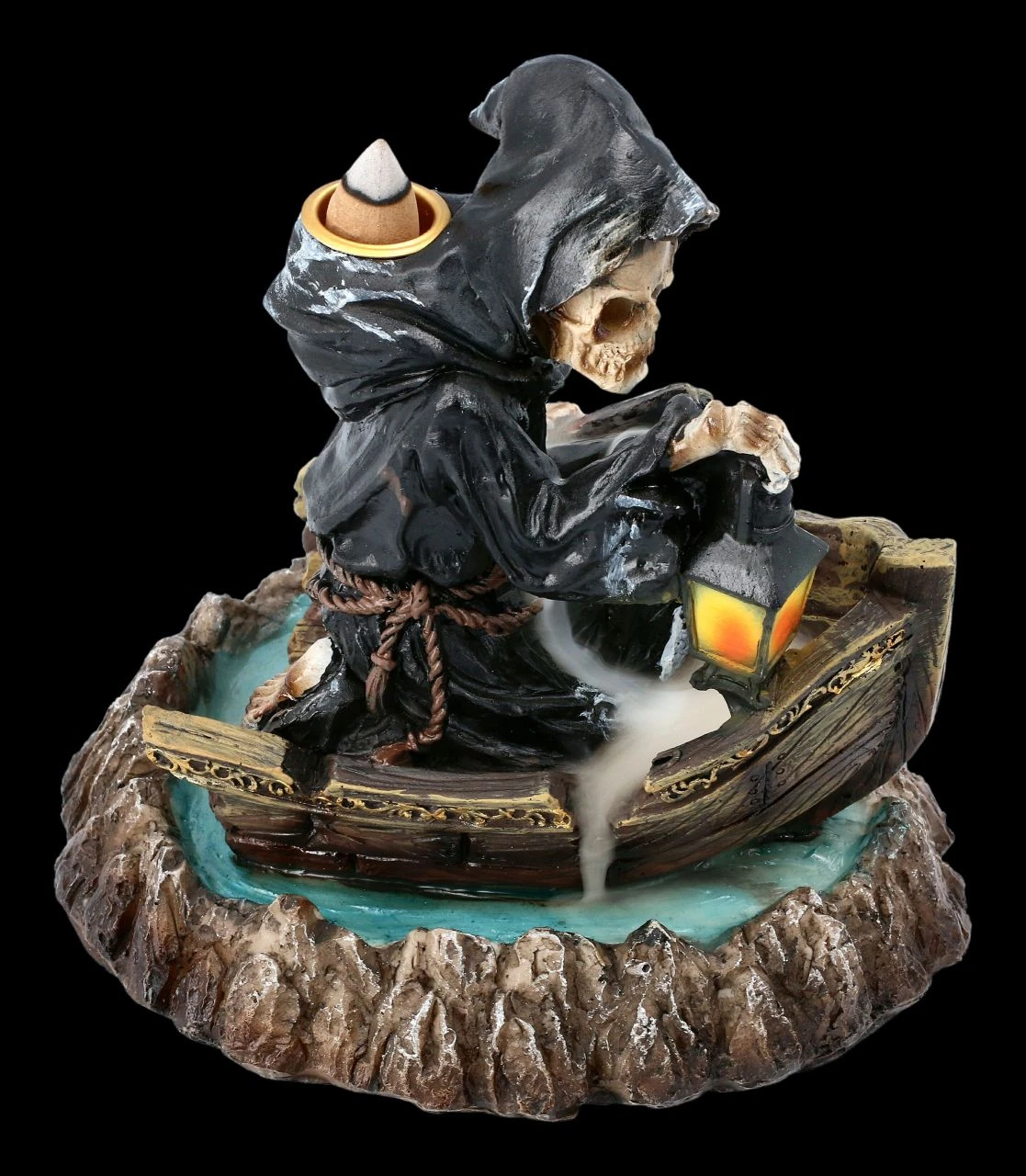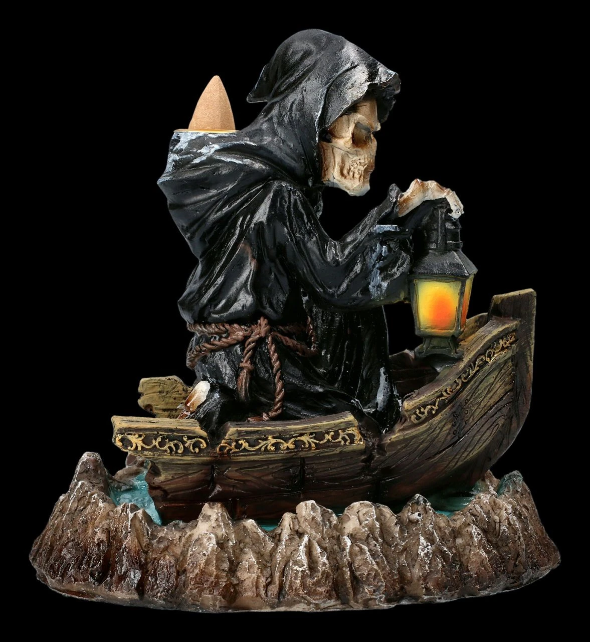 In seinem Fährboot überquert bei diesem faszinierendem Backflow Räucherhalter der düstere Fährmann Charon als Reaper den Styx. Nur wer den Obolus entrichten kann, wird über den Fluß der Unterwelt gebracht. Der mystische Backflow Räucherhalter mit der Höhe von 16 cm, der Breite von 14 cm und der Tiefe von 16,5 cm ist aus handbemaltem Kunststein (Polyresin) gefertigt. Ein Backflow Räucherkegel wird mitgeliefert, weitere finden Sie in unserem Shop. Bitte beachten Sie unbedingt unsere Sicherheitshinweise.