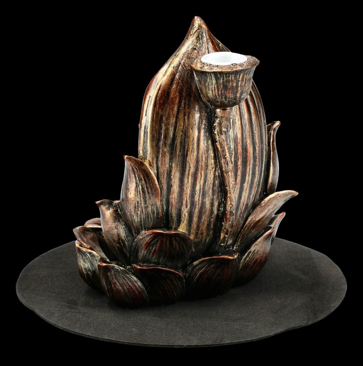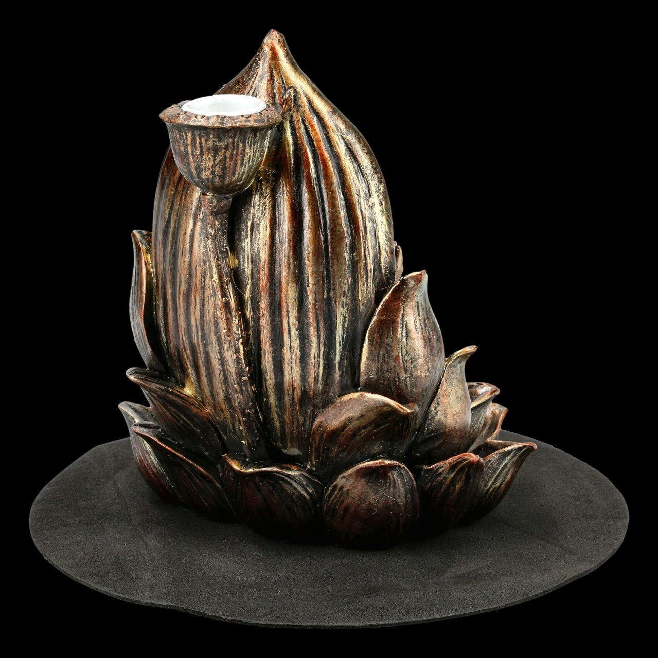 Dass die hinduistische Göttin Lakshmi nicht nur als Beschützerin der Liebe, der Fruchtbarkeit, Gesundheit und Schönheit, sondern auch als Spenderin von Wohlbefinden, Reichtum, Fülle und Überfluss verehrt wird, wird mit diesem schönen und detailreich aus Kunststein (Polyresin) gefertigten Backflow Räucherhalter wunderbar und edel dargestellt. Der ungewöhnliche Backflow Räucherkegelhalter hat eine Höhe von 15 cm, eine Breite von 12 cm und eine Tiefe von 12 cm und ist wunderschön handbemalt. Die Unterlage, auf der Räucherkegelhalter steht, hat einen Durchmesser von 17,5 cm. Wenn der Räucherkegel brennt, fließt der Rauch sanft an den Lotusblütenblättern entlang und endet in dem Boden der Lotusblüte. Die Lieferung erfolgt ohne Räucherkegel, die Sie jedoch in großer Auswahl für jeden Geschmack in unserem Shop finden. Bitte beachten Sie unsere Sicherheitshinweise.