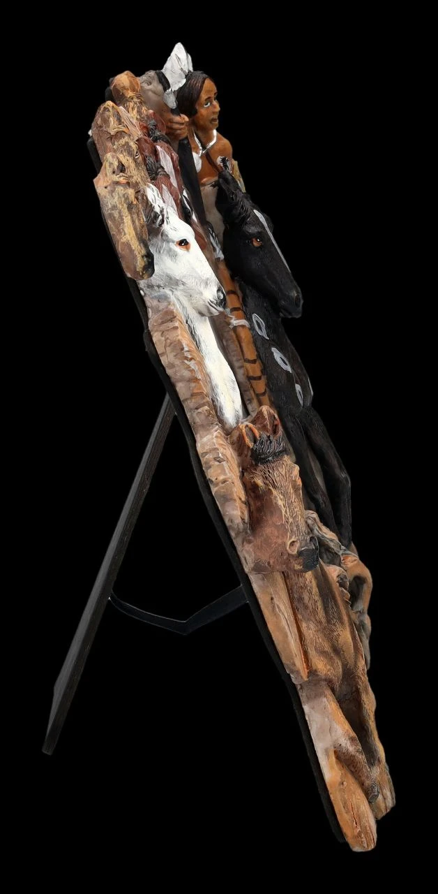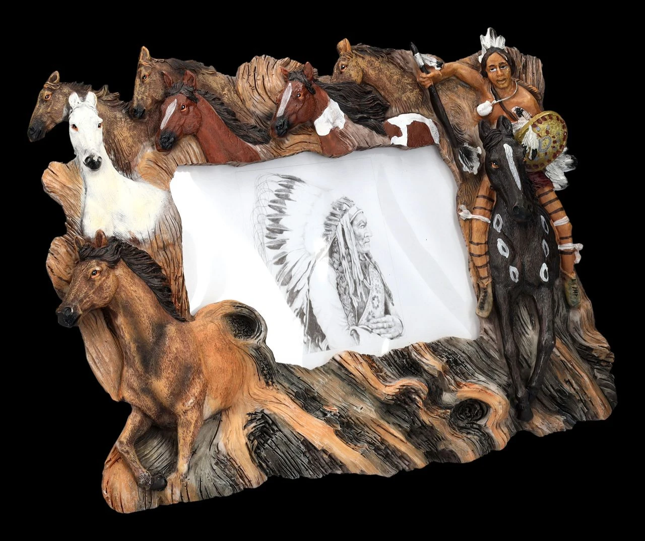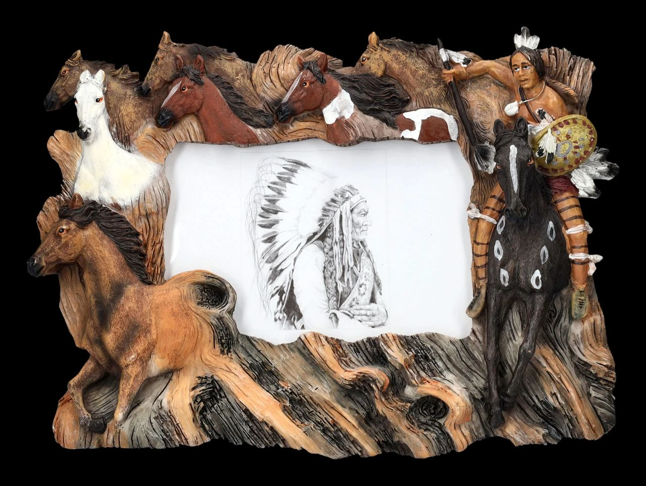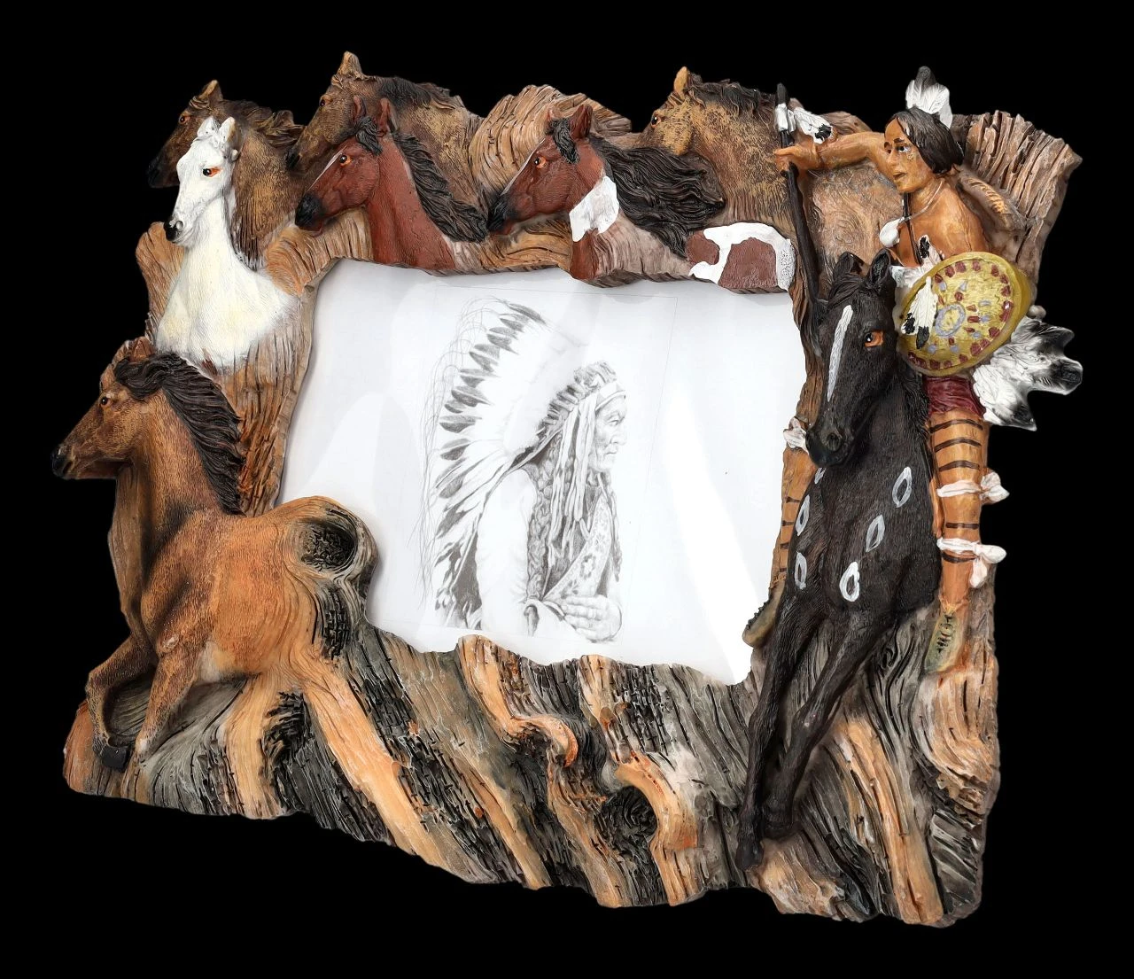 Die wilde Herde mit den jungen Pferden scheint von dem reitenden Indianer gerade eingefangen worden und soll nun in die Koppel getrieben werden. Mit den vielen Details kann das Foto der eigenen Pferde in dem 19 cm hohen, 26 cm breiten und 2 cm tiefen Bilderrahmen perfekt umrahmt werden. In dem Rahmen hat hinter Glas ein Foto mit der Bildgröße von 10 x 15 cm Platz. Der Western-Bilderrahmen mit Pferden ist zum Stellen und wurde plastisch und sehr detailreich aus handbemaltem Kunststein (Polyresin) gefertigt. Mit dem passenden Foto ist er auch ein perfektes Geschenk für Indianer- und Western-Fans.