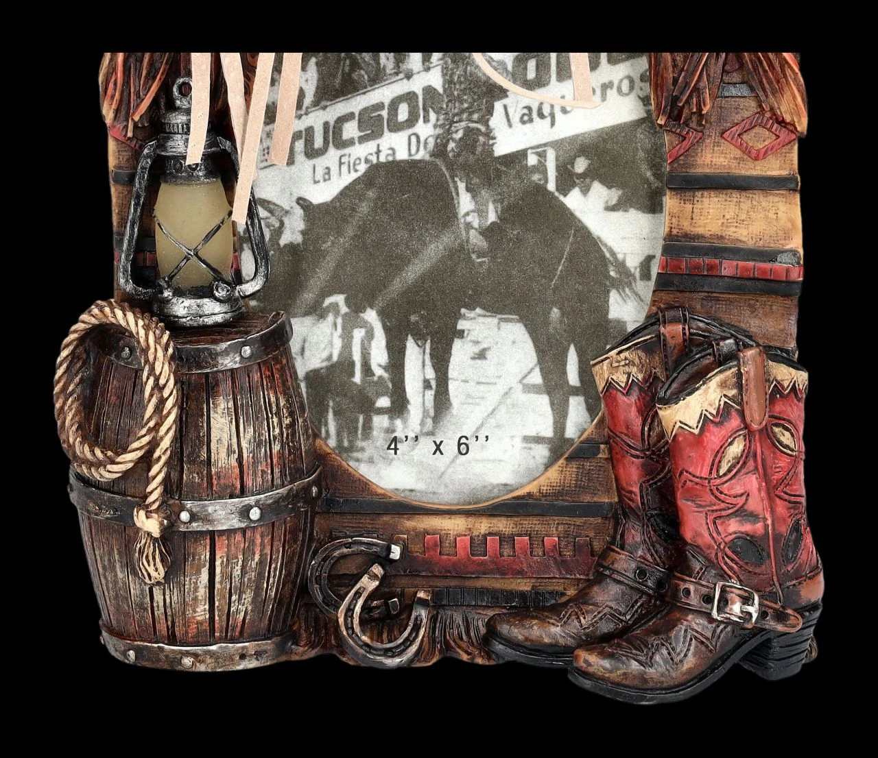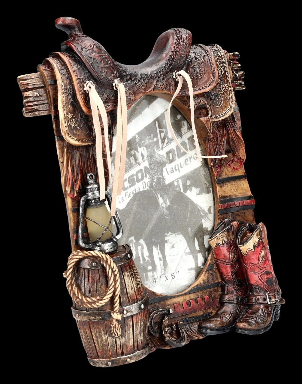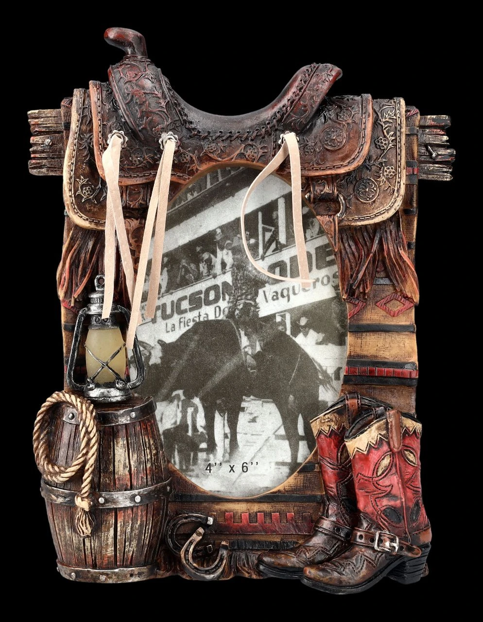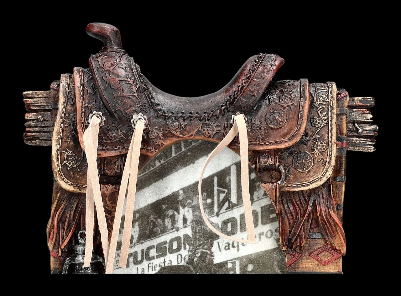 Eine über den Zaun geworfene Decke und darüber der Sattel – am Boden die Stiefel und auf der anderen Seite ein Fass, auf dem die Laterne abgestellt ist – da hat sich anscheinend jemand zur Ruhe begeben. Ein Stück Lasso ist zu sehen, ebenso am Boden liegende Hufeisen – diese vielen Details lassen das Bild in dem 23 cm hohen, 18 cm breiten und 5 cm tiefen Bilderrahmen fast bescheiden aussehen. In dem Rahmen hat hinter Glas ein Foto mit der Bildgröße von 10 x 15 cm Platz. Der Western-Bilderrahmen mit Sattel und Stiefel ist zum Stellen und wurde außerordentlich detailreich aus handbemaltem Kunststein (Polyresin) gefertigt. Mit dem passenden Foto ist er ein perfektes Geschenk für Western-Fans.