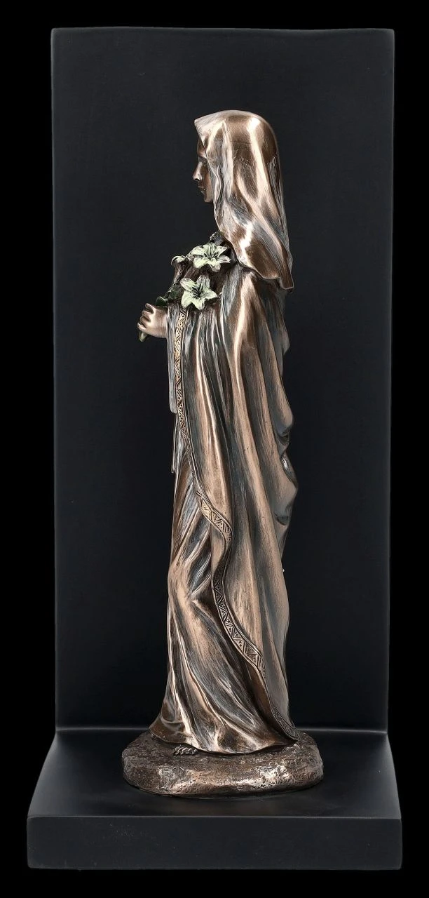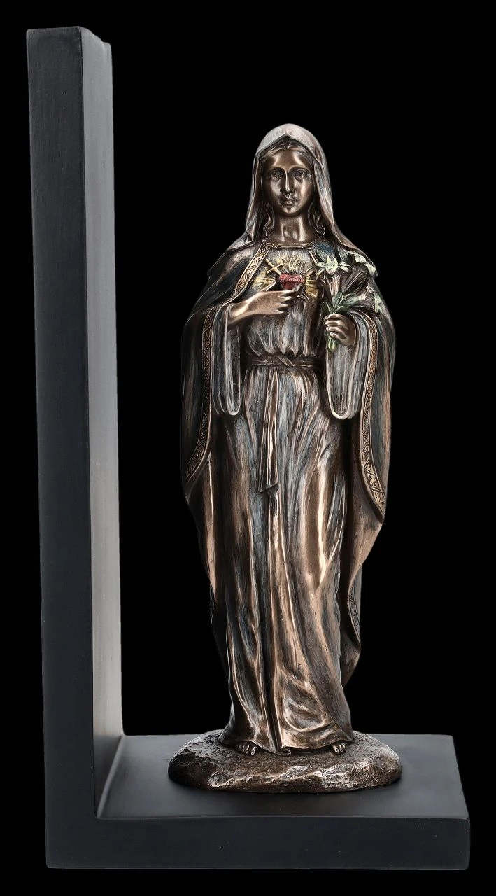Mit der rechten Hand zeigt diese wunderschöne Marien-Figur auf ihr Herz und in der linken hält sie als Zeichen der Reinheit eine Lilie. Diese liebevoll gearbeitete Figur der Madonna kann alle Bücher die einem am Herzen liegen, aber natürlich auch alle mit religiösen oder anderen wichtigen Themen, perfekt stützen. Die außergewöhnliche, 23,5 cm hohe, 12 cm breite und 10,5 cm tiefe Buchstütze aus der Studio Collection von Veronese ist sehr stilvoll und detailreich aus edel bronziertem und fein coloriertem Kunststein (Polyresin) gefertigt. Die Buchstütze mit der Figur der Maria ist nicht nur eine wunderbare Deko für das Bücherregal, sondern passt auch hervorragend zur Buchstütze mit der schönen Jesus-Figur aus unserem Shop. Die Buchstütze ist – vielleicht auch gleich mit dem passenden Buch – ein wunderbares Geschenk. Die Jesus-Figur als Pendant zur Buchstütze mit der Marien-Figur und die Deko sind nicht in der Lieferung enthalten.