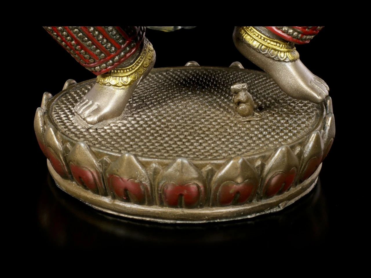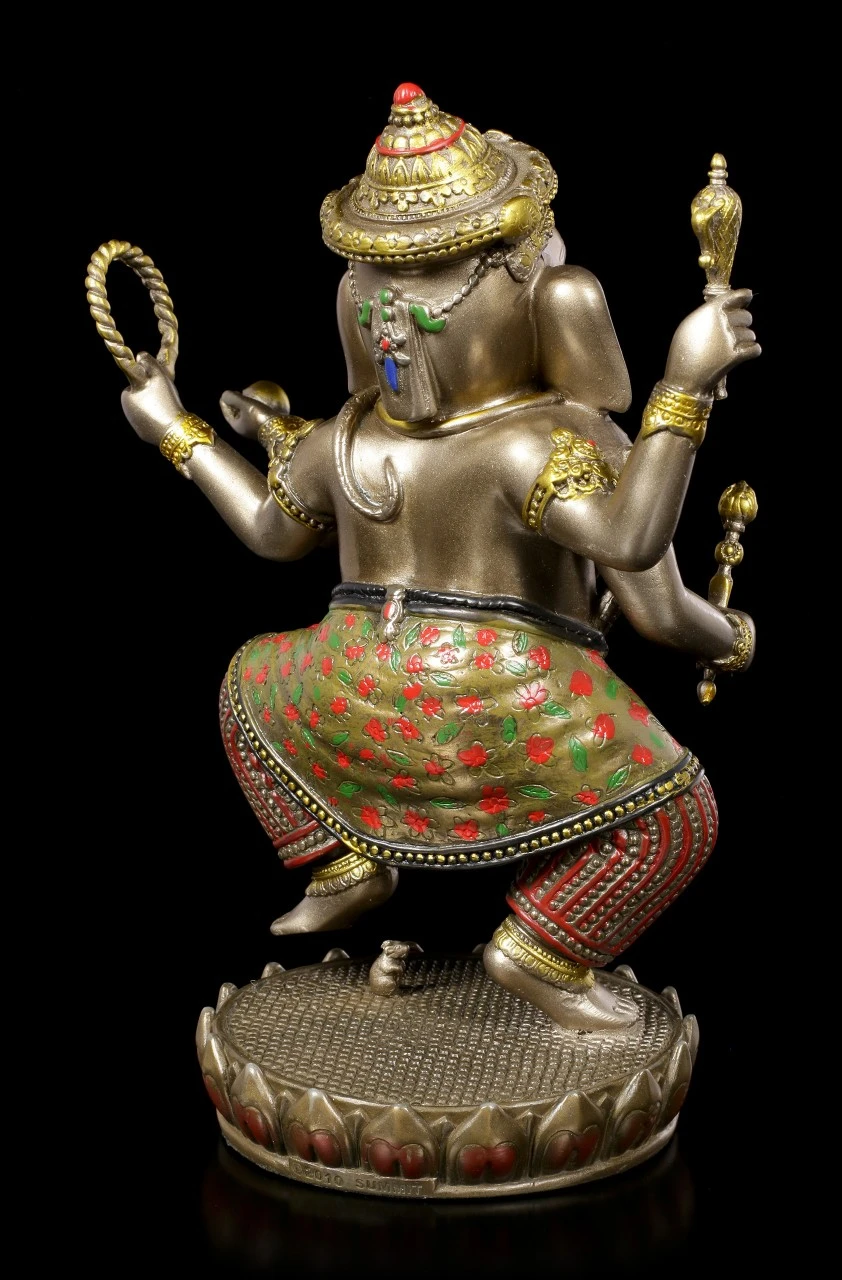 Der tanzende Ganesha ist wohl eine der hinreißenden Darstellungen des hinduistischen Gottes. Die bronzierte und colorierte Figur aus Kunststein (Polyresin) hat unglaublich viele Details, die dem Betrachter erst nach und nach auffallen. Das Seil in seiner Hand z.B. soll die Gläubigen aus ihren weltlichen Problemen ziehen. Der auf einer Lotusblüte tanzende Ganesha ist eine wirklich wunderbar dekorative Figur für jedes Ambiente.