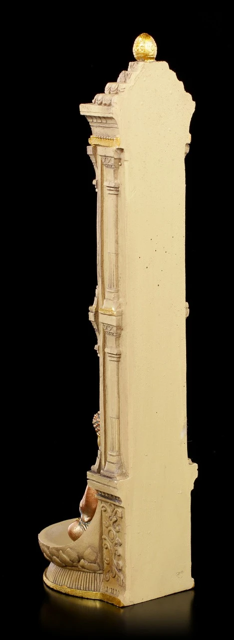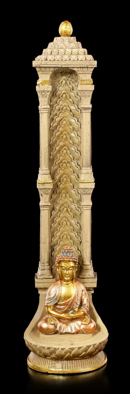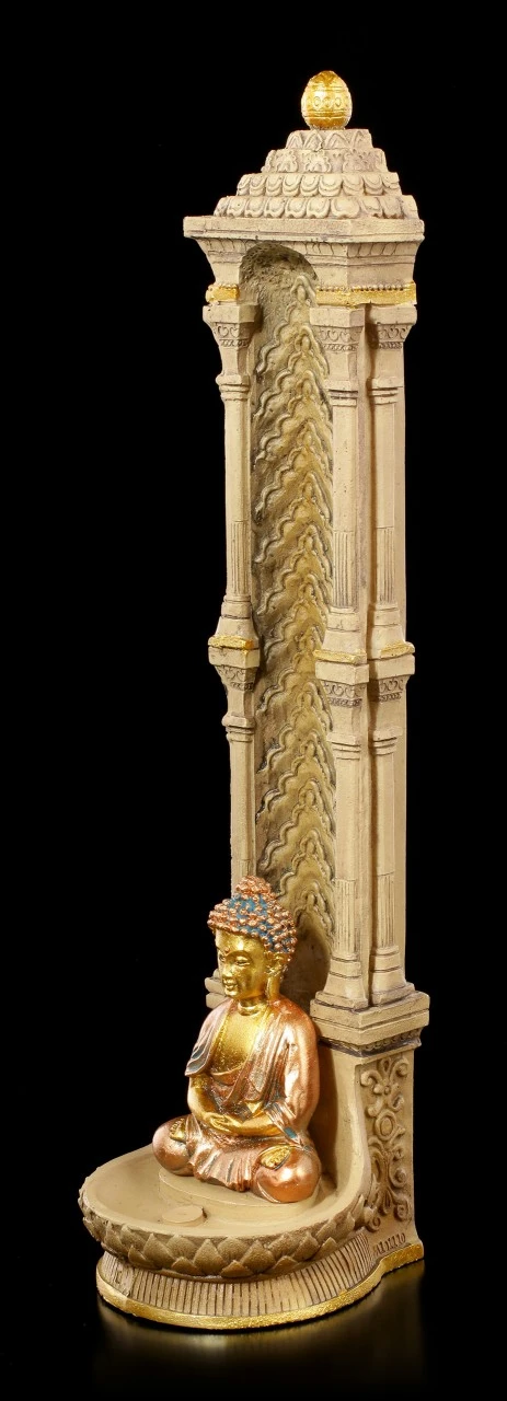 Frieden und Ruhe strahlt dieser Buddha Räucherstäbchenhalter aus. Der Buddha sitzt vor einem Tempel und ist tief ins Gebet versunken. Meditieren Sie mit ihm und lassen Sie sich vom Duft Ihres Lieblingsräucherstäbchen einhüllen. Die Kunststein Figur wurde liebevoll handbemalt.
