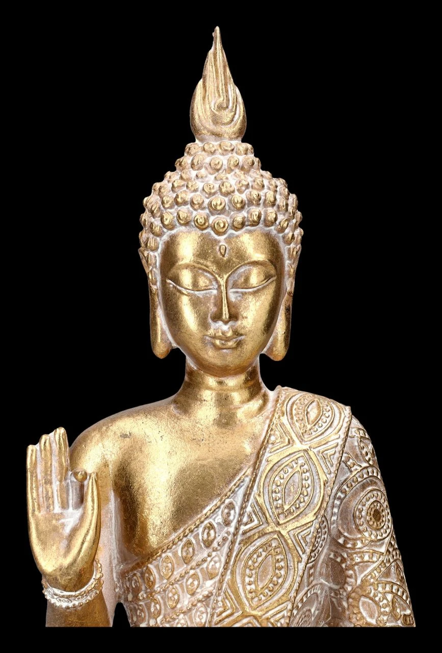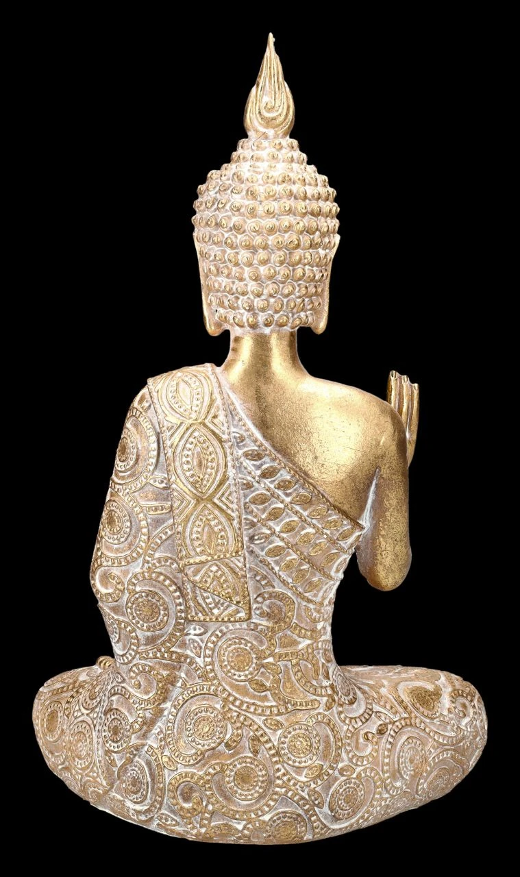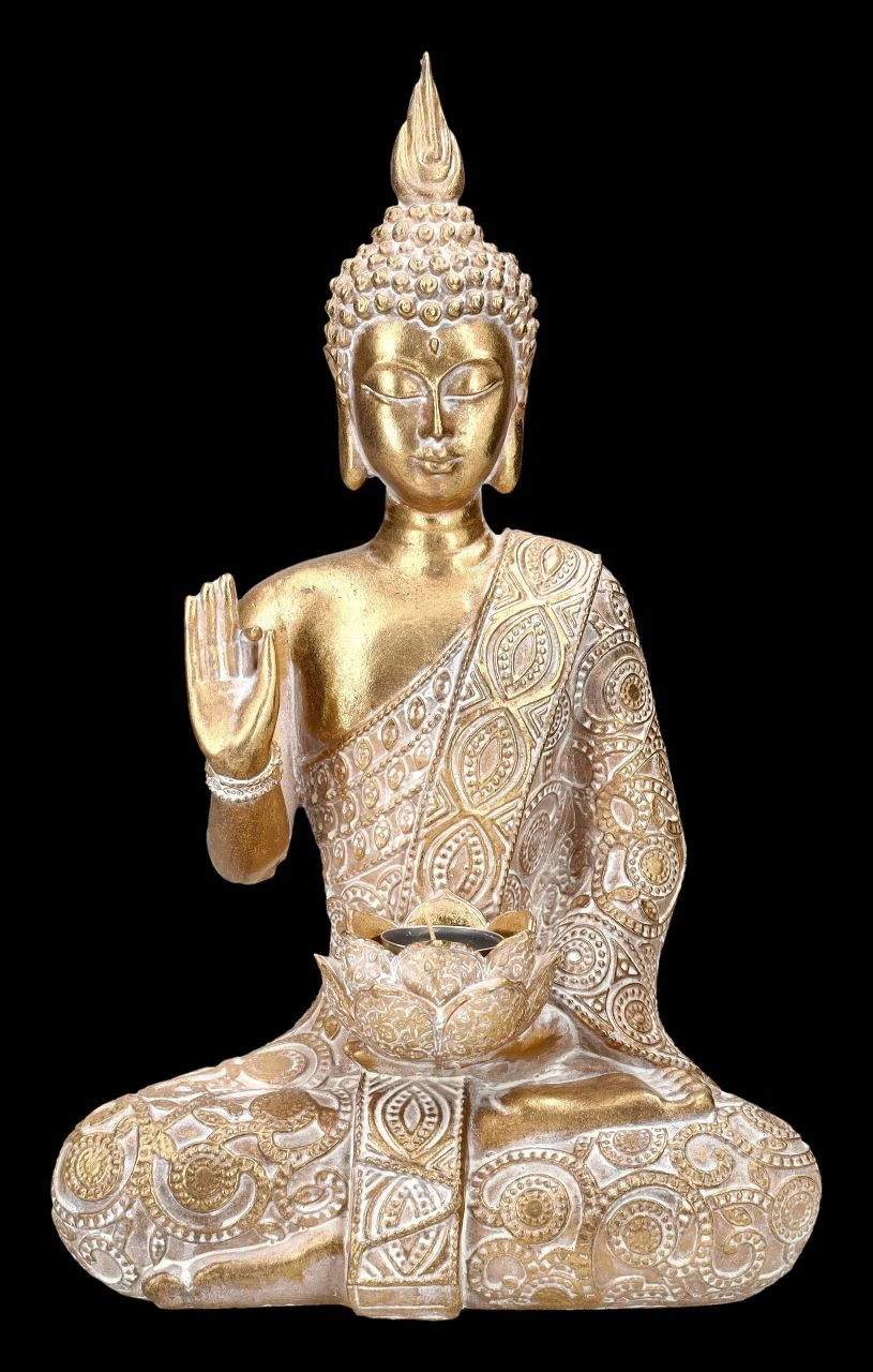 Der edel aussehende Buddha-Teelichthalter gibt mit der zarten Handbemalung in Gold- und Weißtönen nicht nur Ihrem Wohnbereich ein wunderbar asiatisches Feeling. Der 37,5 cm hohe, 24 cm breite und 15 cm tiefe fein verzierte Buddha hält eine Lotusblüte mit einer Aussparung für ein Teelicht in der linken Hand, während er mit der rechten Hand das Symbol für Vitarka Mudra zeigt. Dieses Symbol steht für Argumentation, Unterweisung und Verständnis und passt natürlich auch sehr gut in jedes Yoga-Studio, da der Lehrer so seine Rede untermauert. Der goldfarbene Teelichthalter wurde sorgfältig aus Kunststein (Polyresin) gefertigt. Die Lieferung erfolgt ohne Teelicht.