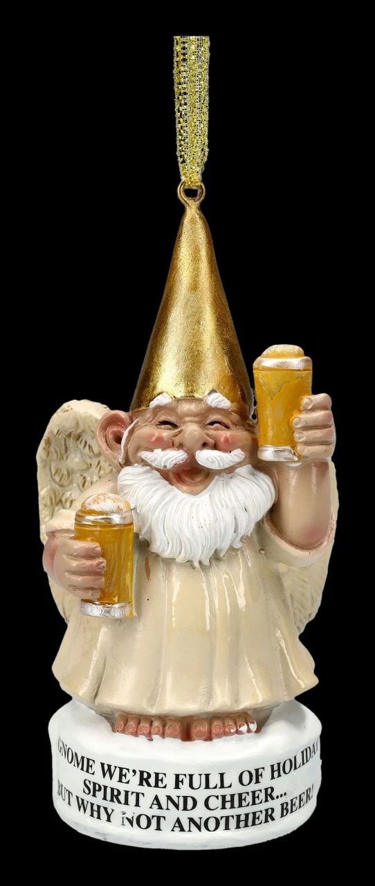 Eine Ähnlichkeit zum Weihnachtsmann lässt nicht verleugnen und für den leidenschaftlichen Gärtner ist es nur natürlich, dass Gartenzwerge auch auf einem Weihnachtsbaum auftauchen – auch mit Engelsflügeln und mit Bier in der Hand… Denn wie steht auf der Wolke doch übersetzt geschrieben: ‚Auch wir Gnome sind voller Feiertagsstimmung und Fröhlichkeit… also warum nicht noch ein Bier…‘ Also Prost! Der lustige Gartenzwerg-Engel als Christbaumschmuck wurde aus handbemaltem Kunststein (Polyresin) gefertigt und ist 10,5 cm hoch, 4,5 cm breit und 4,5 cm tief. Natürlich ist er auch als Geschenkanhänger für den einen oder anderen perfekt geeignet.