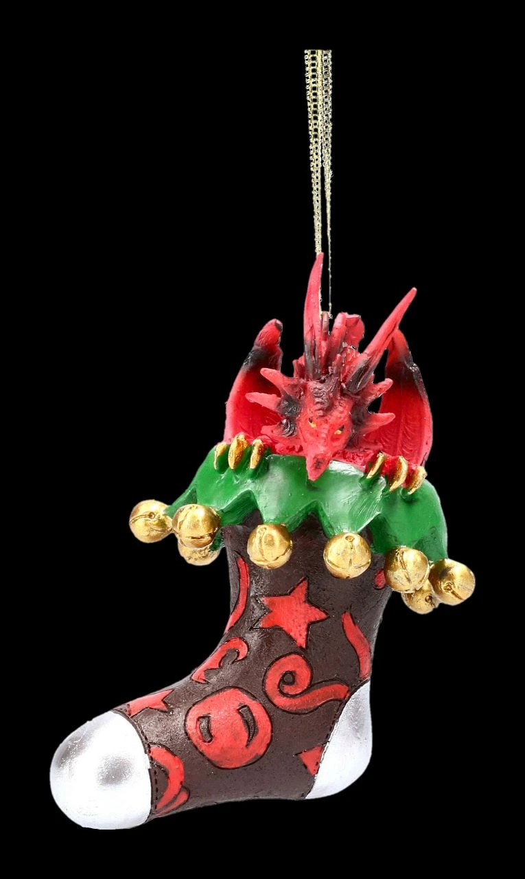 Ein kleiner roter Drache schaut frech aus dem bunten Weihnachtsstrumpf heraus, mit dem Sie Ihren Weihnachtsbaum mal außergewöhnlich schmücken können.. Der witzige Drache mit Strumpf ist aus detailreich handbemaltem Kunststein (Polyresin) gefertigt und zum Hängen. Er ist 11 cm hoch, 7 cm breit und 6,5 cm tief. Dieser Weihnachts-Drache mit Strumpf ist echt lustig und mit den anderen Weihnachtsdrachen aus unserem Shop kombinierbar. So wird Ihr Christbaum zum absoluten Hingucker.