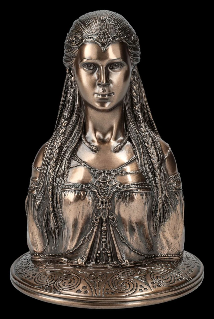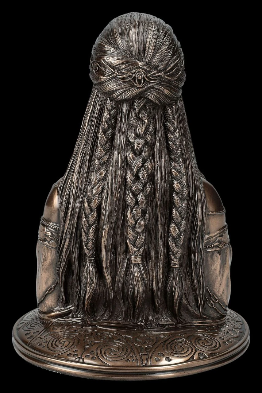 Die wunderschöne Büste aus der Studio Collection von Veronese zeigt Danu,die Muttergöttin aus der keltischen Mythologie Irlands. Sie gilt als Mutter des irischen Clans der Gottheiten ‚Tuatha Dé Danann, also des Volkes der Göttin Danu und wird von vielen heute noch als Fluss- und als Erdgöttin verehrt. Die ästhetisch schöne Büste aus hochwertigem Kunststein (Polyresin) wirkt durch die sorgfältige Bronzierung besonders edel. Sie ist 18,5 cm hoch, 13 cm breit und 13 cm tief und außerordentlich dekorativ und effektvoll. Die elegante Silhouette dieser schönen Büste ist nicht nur ein edler Blickfang, sie ist auch ein ganz besonderes Geschenk für alle, die von den keltischen Mythologie und ihren Göttern fasziniert sind.