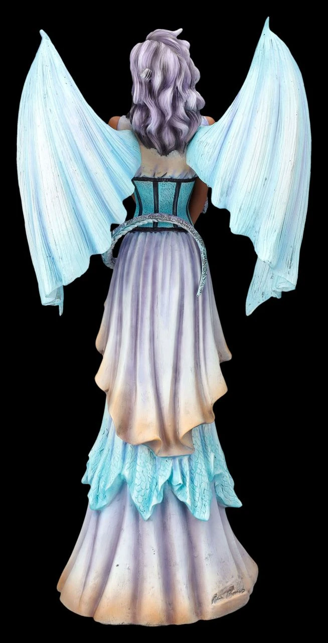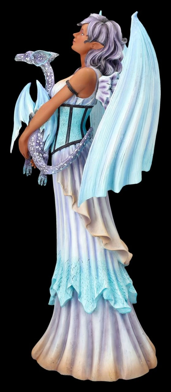 Aufrecht steht der stolze Engel da und hält den ihm anvertrauten Drachen fürsorglich in den Armen. Doch die pastellfarbene Kleidung des schönen Engels soll nicht darüber hinwegtäuschen, dass es sich um einen dunklen Engel handelt, dem man mit Vorsicht begegnen sollte – das beweisen die fledermausartigen Flügel. Die Dark Angel Figur ‚Dragon Keeper‘ der beliebten und berühmten Fantasykünstlerin Amy Brown ist detailreich aus liebevoll handbemaltem Kunststein (Polyresin) entstanden. Die Flügel des beeindruckenden, 42 cm hohen, 21 cm breiten und 17 cm tiefen dunklen Engels sind zum Stecken. Der faszinierende Engel mit dem Drachen ist nicht nur für Sammler ein prächtiges Geschenk.