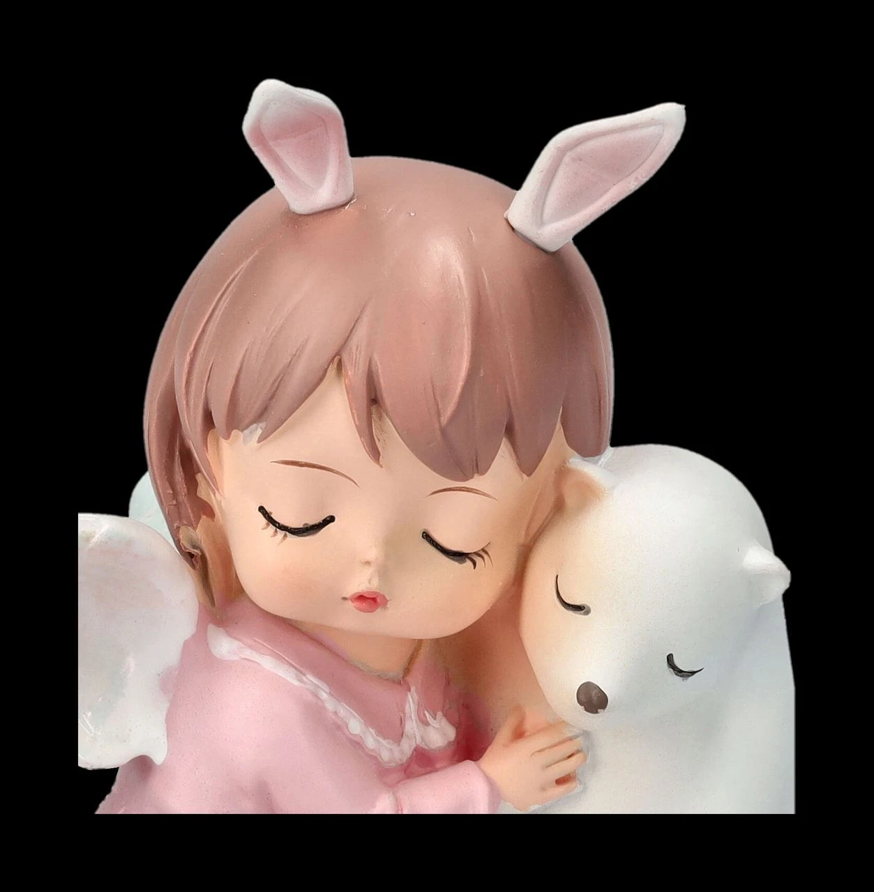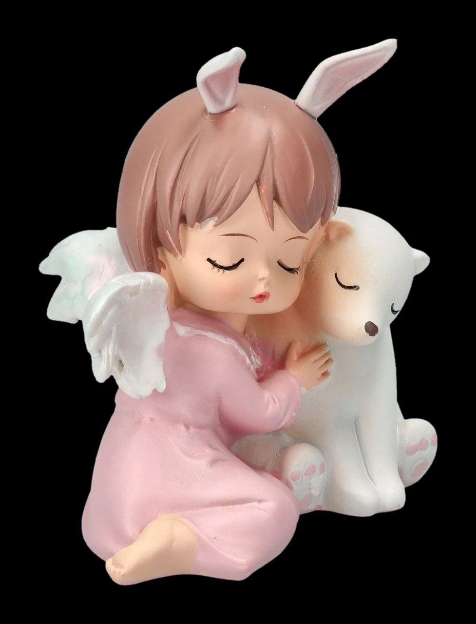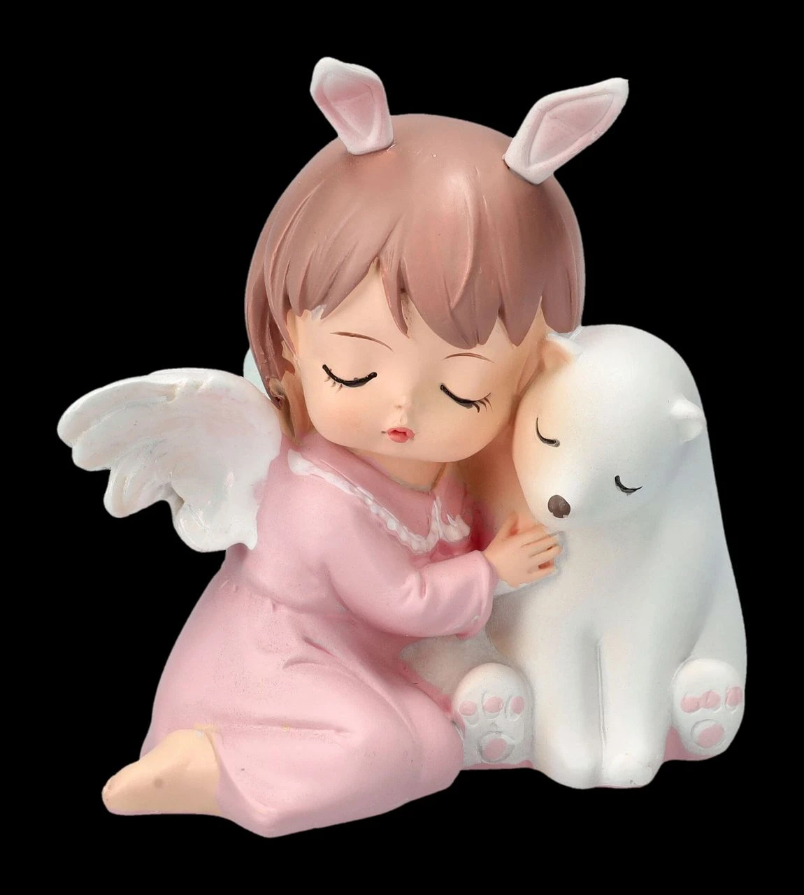 Die Eisbärmama hat den kleinen Eisbären beruhigt in der Höhle zurück gelassen, denn schließlich wird er von seinem Schutzengelchen bewacht. Glücklich kuschelt der kleine Eisbär mit seinem Engelchen, das eigentlich eher wie ein kleines Häschen aussieht. Das 8 cm hohe, 7,5 cm breite und 5,5 cm tiefe putzige Engelchen mit dem Eisbären wurde aus liebevoll handbemaltem Kunststein (Polyresin) gefertigt. Gemeinsam mit den anderen Schutzengelchen aus unserem Shop ist es eine niedliche Frühlingsdekoration und ein süßes Geschenk für alle, die Engel lieben.
