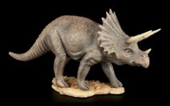 Diese Nachbildung des Triceratops ist natürlich wesentlich kleiner und leichter als das Original. Mit einer Höhe von 10,5 cm, einer Länge von 21 cm und einer Tiefe von 5 cm lässt sich die Figur auch vom Gewicht her viel leichter ins Regal oder auf einen Tisch stellen. Er wurde aus Kunststein gefertigt und im Anschluss handbemalt. Durch die Verarbeitung und die Bemalung wirkt die Haut des Sauriers sehr lebensnah. Durch die Schattierungen sind die Hautfalten und die Muskulatur gut zur Geltung gekommen. Es entsteht so einen Eindruck von Bewegung und Lebendigkeit.