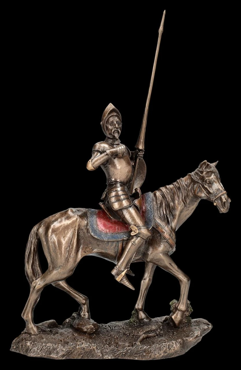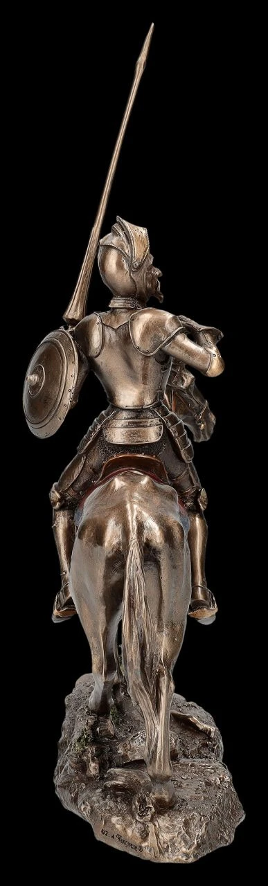 Don Quijote, der ‚Ritter von der traurigen Gestalt‘ aus dem berühmten Roman von Miguel de Cervantes Saavedra, sitzt bei dieser wunderbar detailreichen Figur auf seinem Pferd Rosinante. In der Hand hält er die Lanze, mit der er gegen die Windmühlen kämpfte, die er für gefährliche Riesen hielt. Die Lanze ist zum Stecken. Die mit Lanze 33 cm hohe (ohne Lanze 24 cm), 20,5 cm breite und 10 cm tiefe Don Quijote Figur ist aus edel bronziertem, hochwertigem Kunststein (Polyresin) gefertigt und wurde sehr zurückhaltend coloriert. Sie stammt aus der Studio Collection von Veronese und ist für jeden, der die Geschichte um Don Quijote mi seinem Pferd Rosinante und seinem Knappen Sancho Panza faszinierend findet, ein vielsagendes Geschenk. Aber auch für alle, die manchmal das Gefühl haben gegen Windmühlen zu kämpfen, ist diese herrlich altmodische Figur eine perfekte Deko..