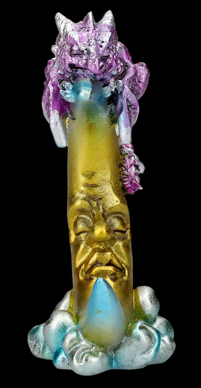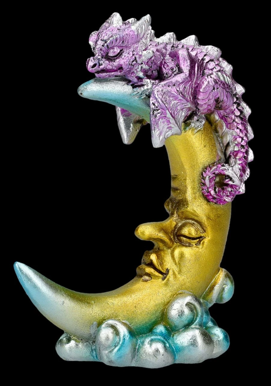 La Li Lu, nur der Mann im Mond schaut zu…. Und schon ist das kleine Drachenbaby, das es bis zur Spitze der Mondsichel geschafft hat, eingeschlafen. Aber auch der Mond selbst schläft selig auf seinem Wolkenbett. Die niedliche Drachen-Figur mit dem kleinen schlafenden Drachen auf dem Mond ist 9 cm hoch, 7 cm breit und 4 cm tief. Sie ist aus liebevoll handbemaltem Kunststein (Polyresin) und nicht nur eine niedliche Deko für Sammler, sondern ein perfektes Geschenk für alle Drachen-Freunde..