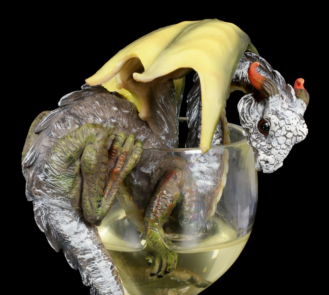 Aus der Serie Drinks & Dragons von Stanley Morrison ist diese tolle Drachen Figur im Weißweinglas – White Wine. Der handbemalte Kunststein Drache sitzt im Weißwein Glas und badet im Wein, ob er wohl so zu seinen hellen Schuppen gekommen ist?! Die Drachen Figur ist ein witziges Geschenk für jeden Sammler.