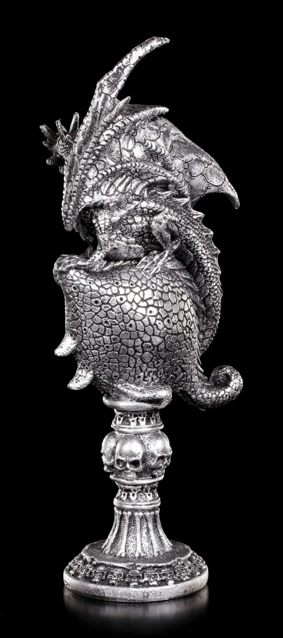 Silberfarbene Drachenfigur bewacht grünes Auge