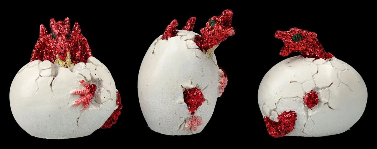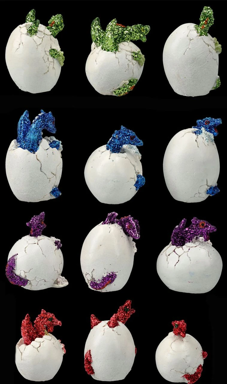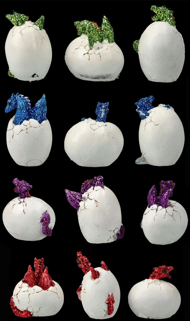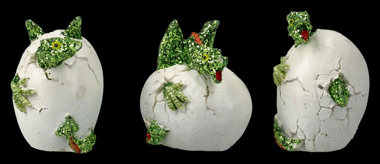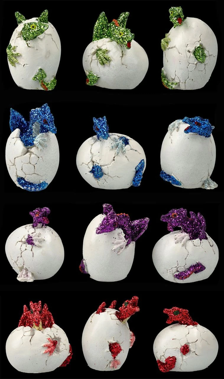 Ein tolles Geschenk, das man perfekt mit seinen Drachenfreunden teilen kann, sind diese niedlichen Drachen Figuren im 12er Set. Jeweils drei blaue, drei rote, drei grüne und drei lilafarbene kleine Drachenbabys schlüpfen gerade aus ihren Eiern. Die 4 – 5 cm hohen, 4 – 5 cm breiten und 3 – 3,5 cm tiefen Eier, aus denen sich die kleinen Drachen gerade befreien möchten, sind aus liebevoll handbemaltem Kunststein (Polyresin).
