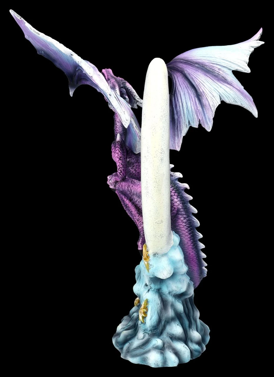 Wie sein Namensvetter, der zu den sieben olympischen Geistern gehört, fühlt sich auch der Drache Bathor als Ordnungshüter des Himmels. Über den sternenbesetzten Wolken ist der silbernen Halbmond zu sehen, auif der startbereit der imposante Drache Bathor sitzt. Wehe dem, der hier stört – Bathor wird für Ordnung sorgen. Der fantastische Drache Bathor auf dem Halbmond ist sehr detailreich aus hochwertigem Kunststein (Polyresin) gefertigt und kunstvoll von Hand bemalt. Die großen, blau-violetten prächtigen Flügel des 33 cm hohen, 17 cm breiten und 28 cm tiefen Drachen sind zum Stecken. Die fantasievolle Skulptur ist ein wunderbares Geschenk für jeden Drachen-Sammler.