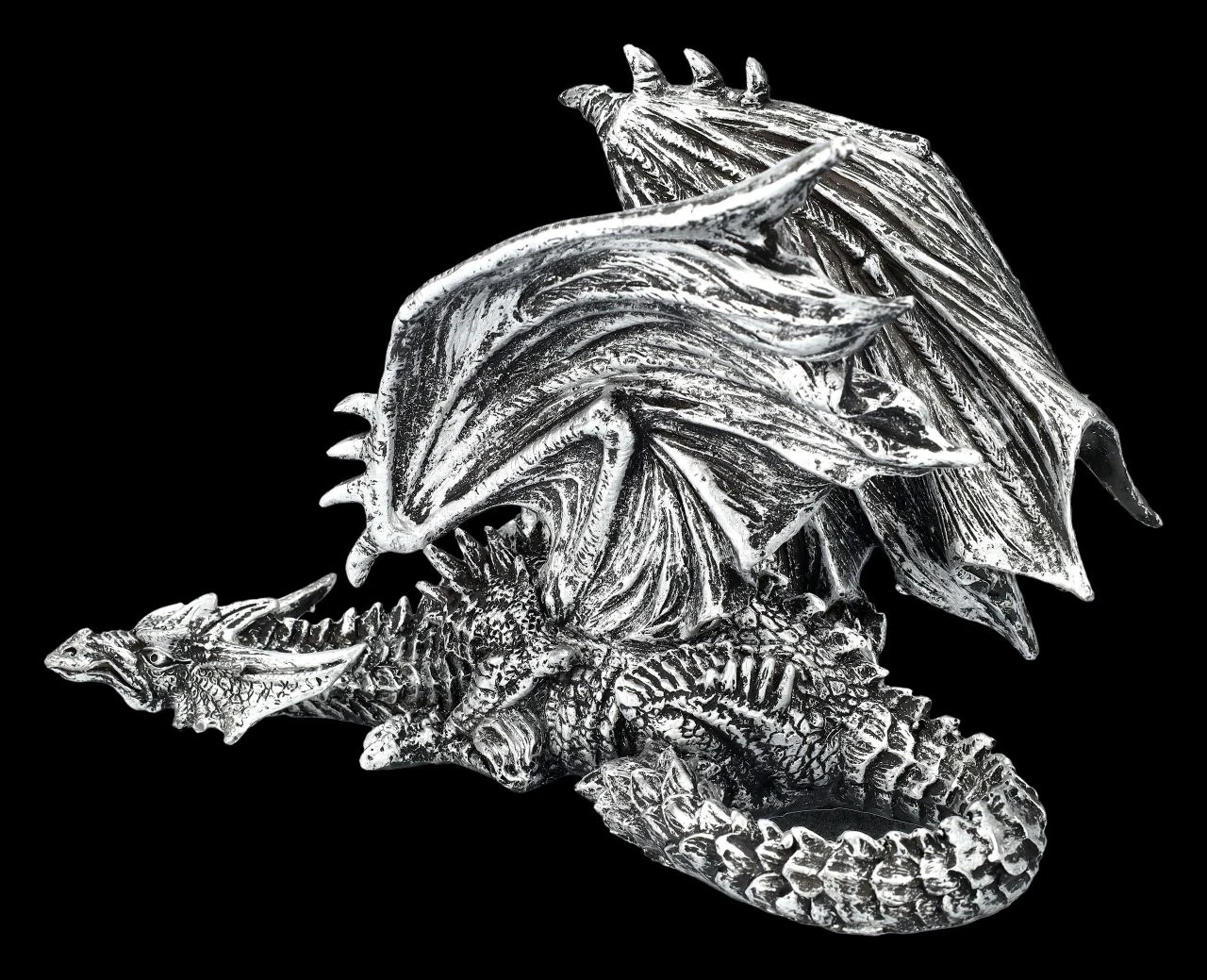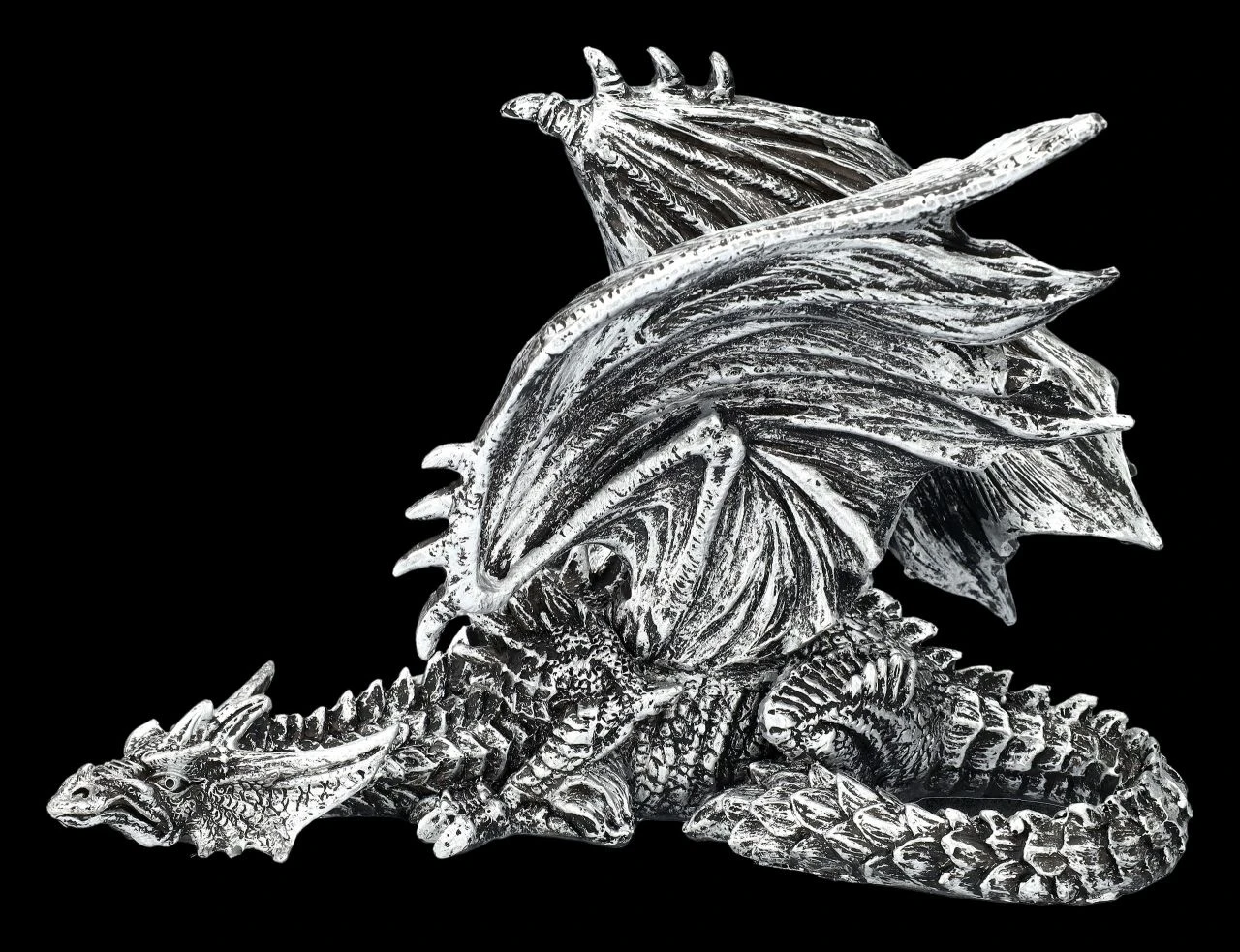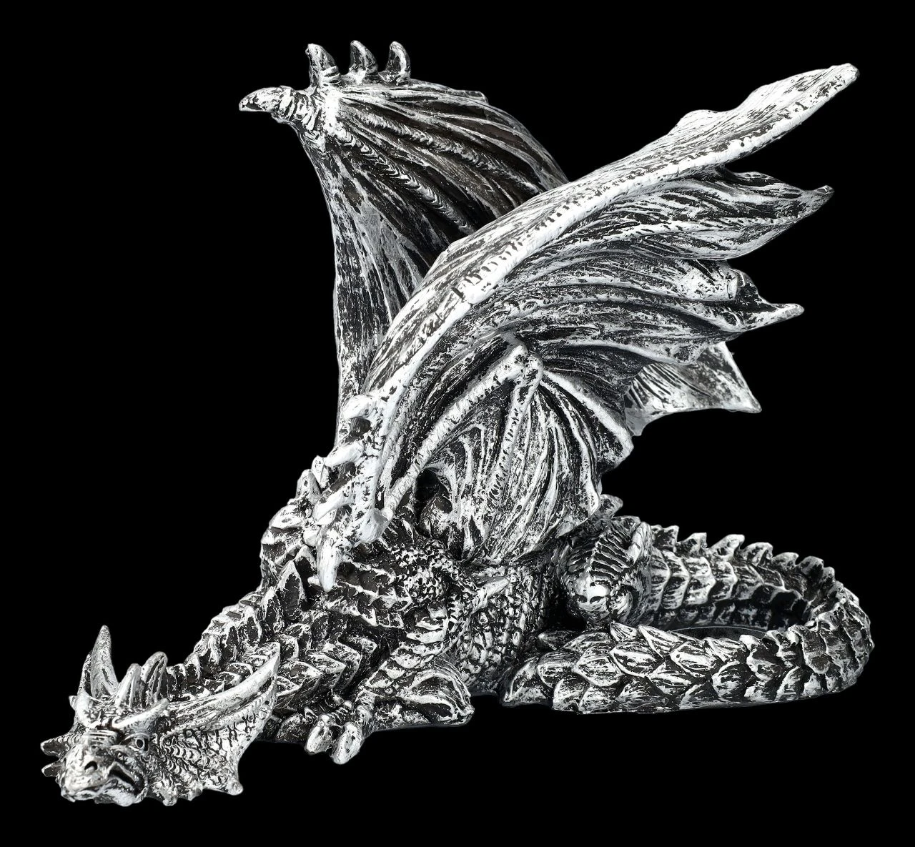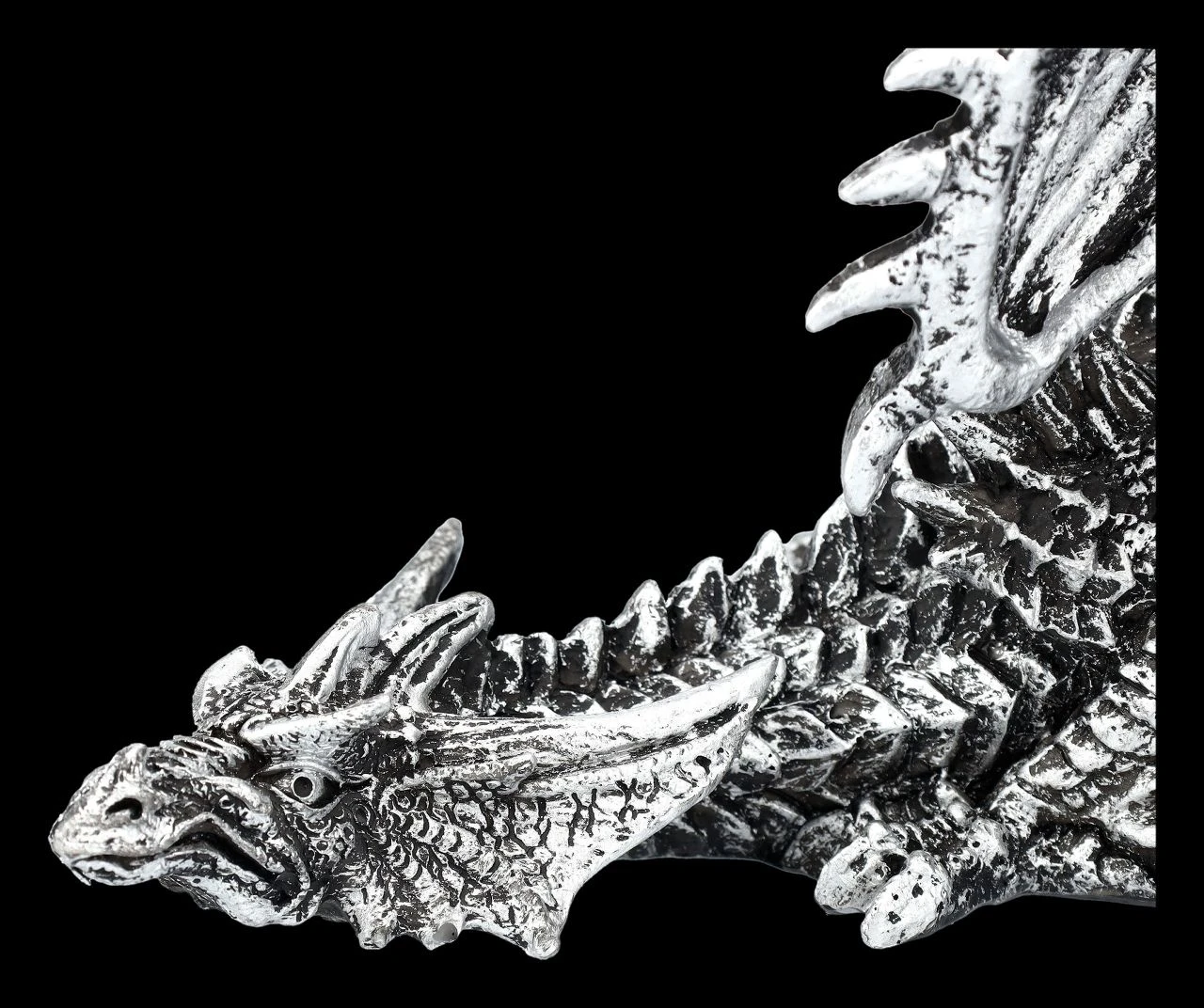 Vorsichtig und seine Beute fest im Blick schleicht sich der silberne Drache an. Er muss sich sehr langsam bewegen, damit kein Rascheln seine Beute warnt. Das silberfarben handbemalte Fabelwesen wurde sorgfältig aus Kunststein (Polyresin) gefertigt. Mit der Höhe von 16,5 cm, der Breite von 24,5 cm und der Tiefe von 12,5 cm ist der Drache, der sich hier so vorsichtig anschleicht, auch ein fantasievolles Geschenk für alle Drachenfreunde.