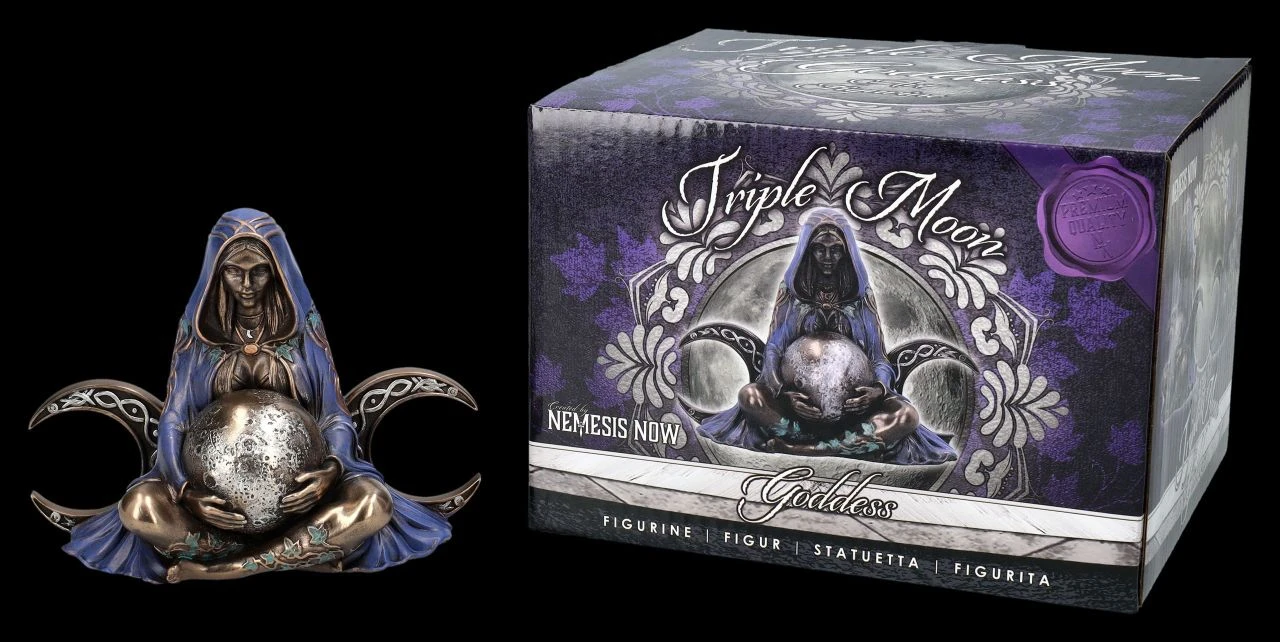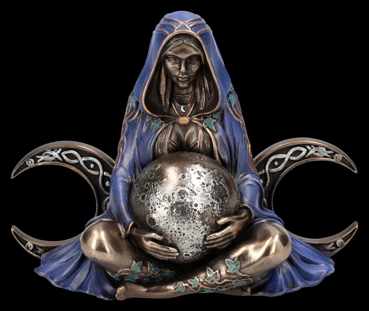 Von den beiden silberfarbenen Mondsicheln des zu- und abnehmenden Mondes begleitet hält die Mondgöttin den Vollmond in ihrem Schoß mit ihren Händen liebevoll umfangen. Die Figur der Dreifachen Mondgöttin stellt als Jungfrau, Mutter und Weise alle drei Gestalten des natürlichen Kreislaufes des Werden, Seins und Vergehens dar. Diese kleine, 8 cm hohe, 11 cm breite und 6,5 cm tiefe Göttin-Figur in dem mit keltischen Symbolen verzierten blauen Umhang wurde aus handbemaltem Kunststein (Polyresin) gefertigt und ist ein wunderbares Geschenk für alle, die an eine von der Dreifach-Mond Göttin symbolisierte, naturverbundene Spiritualität glauben. Die symbolhafte Figur kommt inklusive eines schön bedruckten Geschenkkartons.