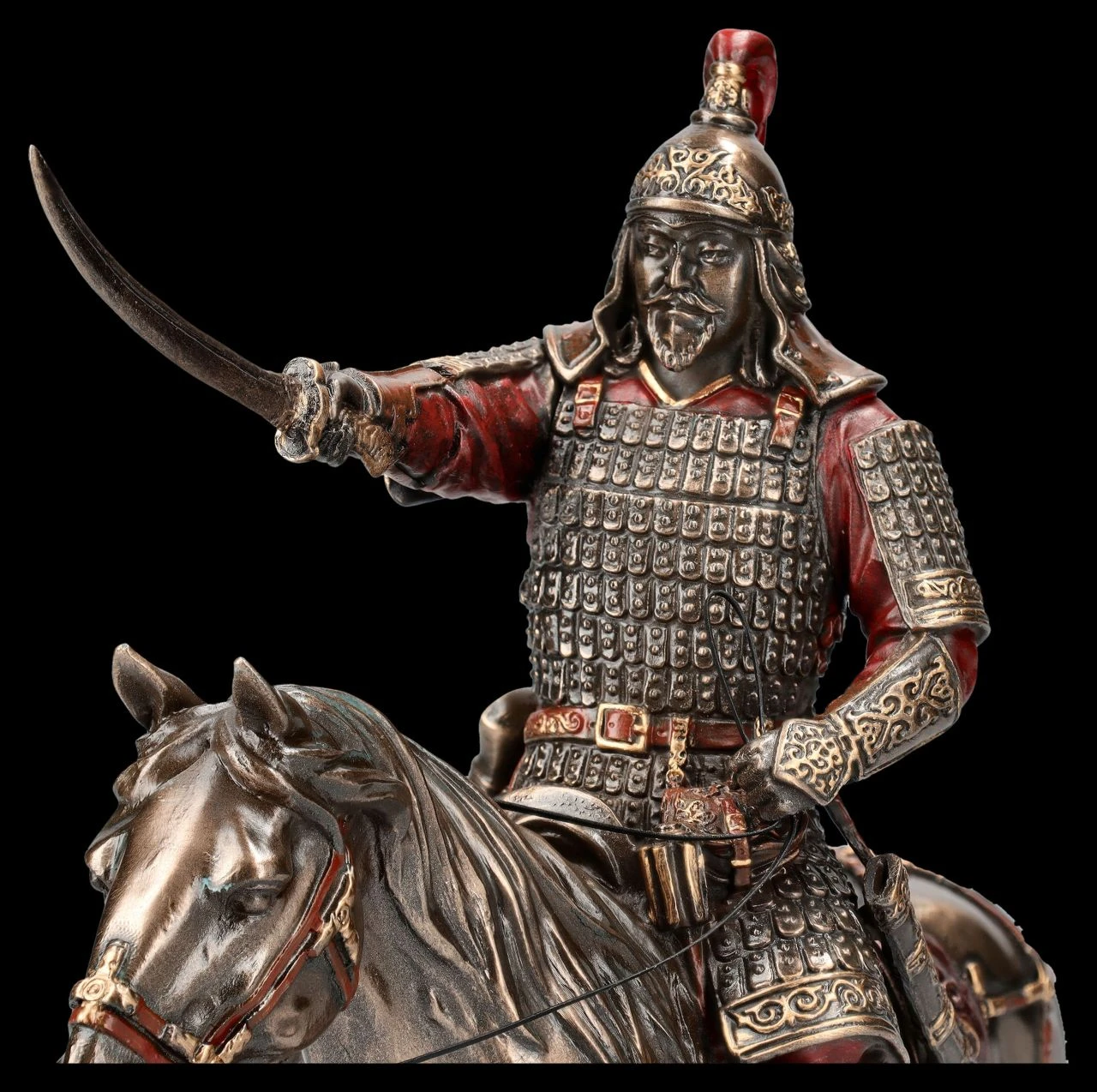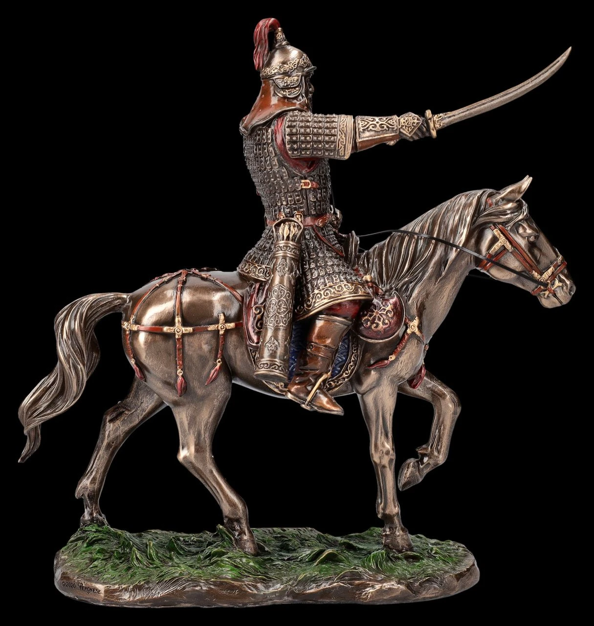 Die prachtvolle Figur des Dschingis Kahn auf dem Pferd und mit Säbel in der Hand stammt aus der Studio Collection von Veronese und ist fantastisch detailreich aus hochwertigem Kunststein (Polyresin) gefertigt. Die 24 cm hohe, 23,5 cm breite und 9,5 cm tiefe bronzierte Figur ist sehr zurückhaltend coloriert und wirkt dadurch sehr beeindruckend und edel. Der Gründer des Mongolischen Reiches Dschingis Khan vereinte einst die mongolischen Stämme, die als Nomaden lebten und untereinander grenzenlos verfeindet waren. Er eroberte und plünderte mit seiner wilden Horde weite Teile Nordchinas und Zentralasiens und drang mit seinen Truppen sogar bis Persien vor. Dschingis Khan regierte sein Riesenreich von 1206 bis 1227, eine Zeit, in der er nicht nur Furcht und Schrecken verbreitete, sondern in der es ihm gelang, bis heute zur Legende zu werden. Als er 1227 starb, wurden angeblich alle lebendigen Wesen seiner Umgebung – einschließlich der 2000 Begräbnisgäste getötet und mit ihm beigesetzt. Die geheime Grabstätte wurde allerdings bis heute nicht gefunden. Für alle Bewunderer von Dschingis Khan ist diese fantastische Figur auch ein beeindruckendes Geschenk.