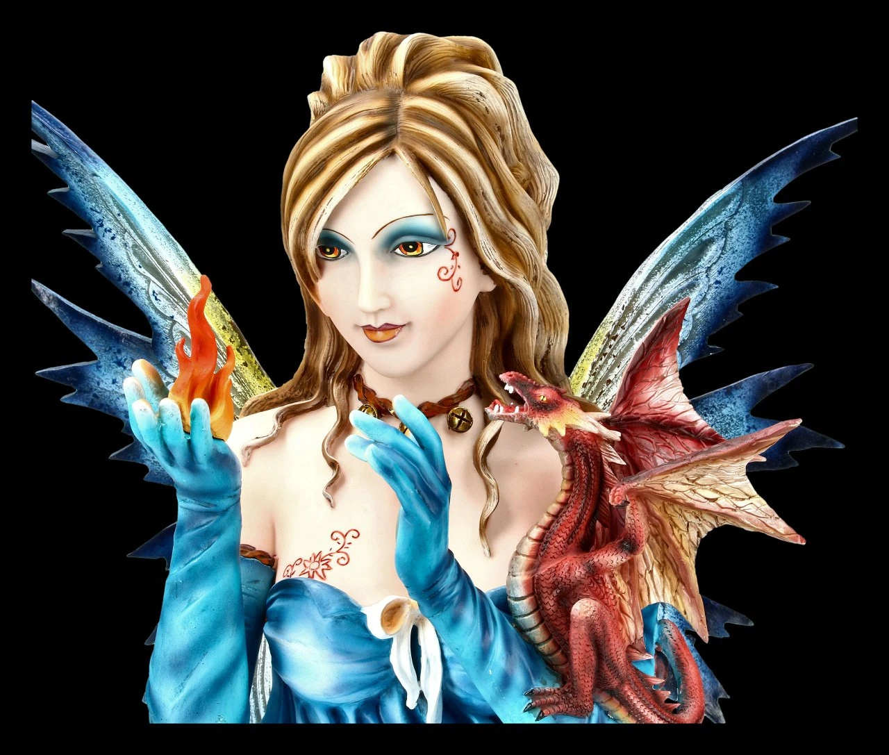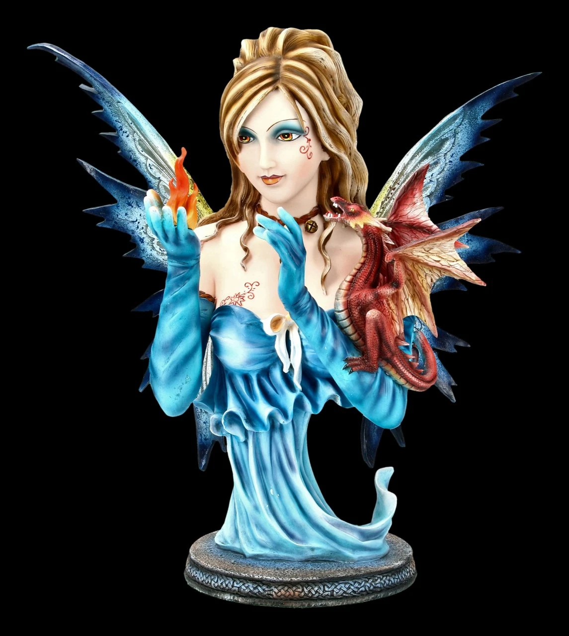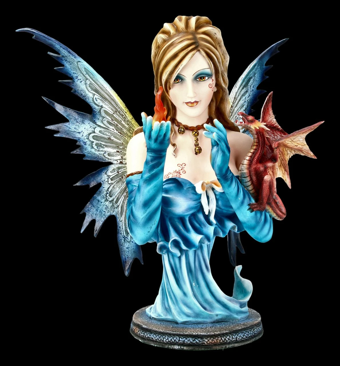 Ist diese Feen Büste nicht wunderschön? In ihrer einen Hand lässt sie ihr Element, das Feuer, hell brennen und in ihrer anderen hält sie einen kleinen Feuerdrachen. Durch die feine und detaillierte Machart mit der zarten und gelungenen Farbgebung wirkt die Fee beinahe lebendig. Schauen Sie sich doch nur ihr zartes Gesicht und ihr wunderbares Kleid an. Soviele kleine Details laden den Betrachter zum Staunen ein.