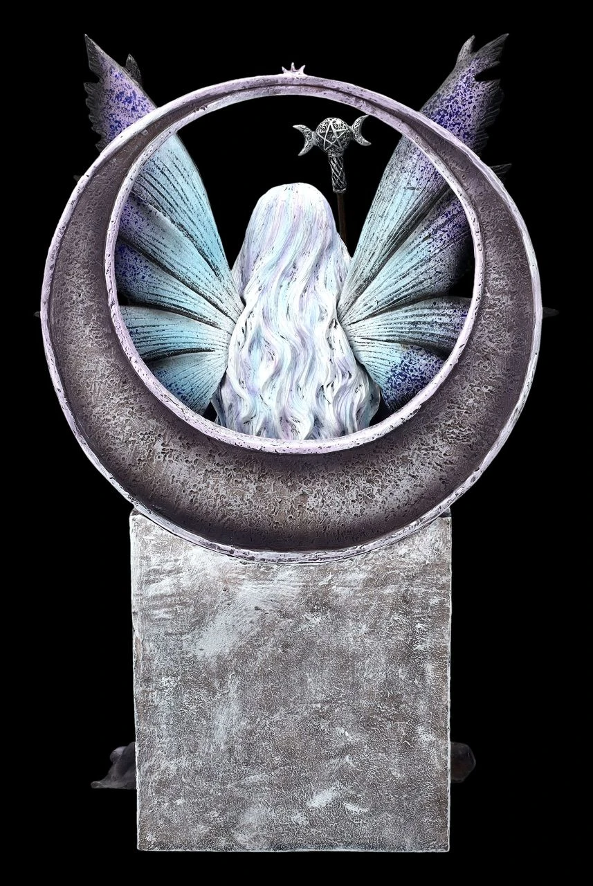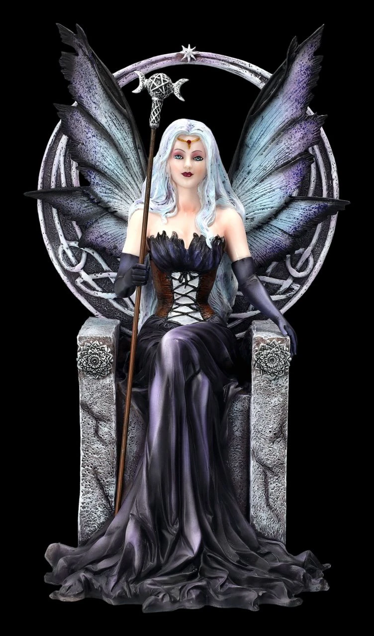 Einmal im Jahr kommt die Königin der Magier zu jedem ihrer Elfenvölker und hält Audienz. Denn auch im Elfenreich, tief in den dunklen Wäldern der Fantasie, gibt es immer wieder Probleme, die gelöst werden müssen. Es soll schließlich Glück und Frieden im Elfenreich herrschen, dann können.alle märchenhaften Wesen des Waldes zufrieden sein. In ihrem nachtblauen Kleid mit den Rabenfedern, die den Ausschnitt schmücken und wie Spitzen aus ihrem Mieder hervorschauen, hat die geheimnisvolle Elfe auf ihrem Thron Platz genommen. Ihr 28 cm langes, 3 cm breites und 1 cm tiefes Zepter mit dem Wicca Symbol des Dreifachmondes, der die naturverbundene Spiritualität demonstriert, zeigt an, dass sie weise und allen wohlgesonnen ist. Auch die Rücklehne ihres steinernen Throns wird von zwei Mondsicheln gebildet. Ihre schönen Flügel in den Farben eines Nachtfalters und das Zepter sind zum Stecken Die fantastische, 33 cm hohe, 18 cm breite und 18,5 cm tiefe Elfen-Figur Magic Monarch wurde aus liebevoll handbemaltem Kunststein (Polyresin) gefertigt und ist auch ein wunderbares Geschenk für jeden, der von der mystischen und magischen Welt der Elfen begeistert ist.