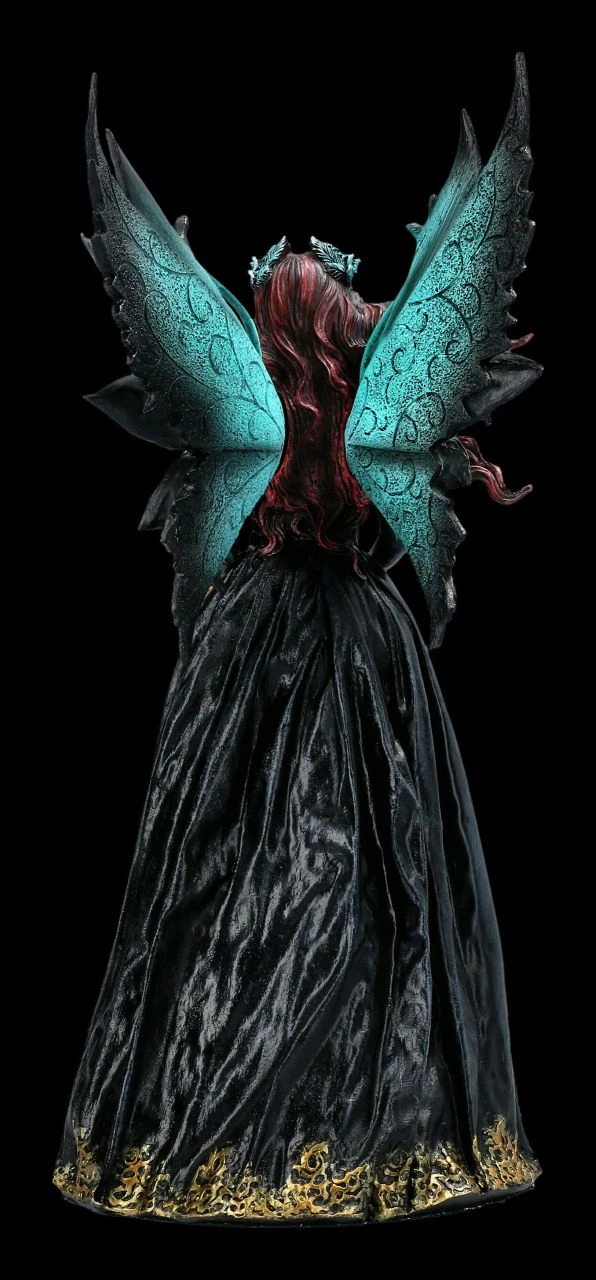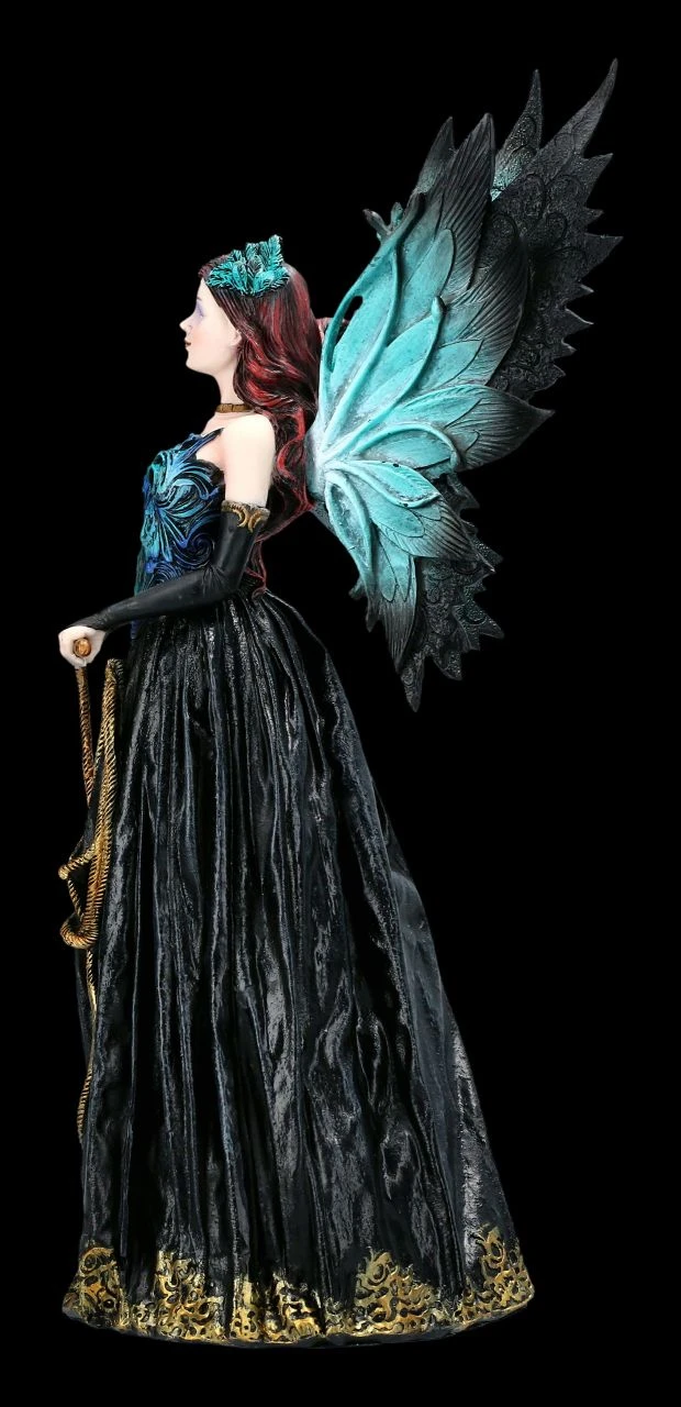Wunderschön mit ihren langen roten Haaren und dem selbstbewussten Blick, steht die Dunkelelfe Juna da und hält in den Händen mit den langen schwarzen Handschuhen eine goldene Peitsche. Nur wer mutig genug ist und den Saum ihres Kleides mit dem schwarzen Rock mit goldener Bordüre und dem blauen, wie aus Pfauenfedern gefertigten Mieder berühren möchte, darf sich ihr nähern. Aus wunderschön handbemaltem Kunststein (Polyresin) gefertigt, hat die schöne Dunkelelfe Juna eine Höhe von 34 cm, eine Breite von 15,5 cm und eine Tiefe von 16 cm. Die Flügel sind zum Stecken. Die Schönheit ist ein besonderes Geschenk und eine außerordentlich dekorative Elfe.