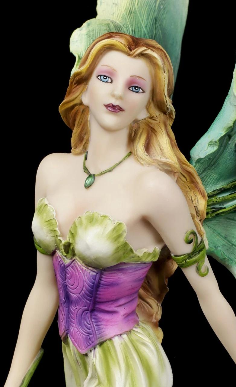Diese anmutige Lotuselfe liebt die wunderschönen Lotusblüten über alles. Ihre Flügel sind wie ein grünes Lotusblatt mit einer Lotus Blume geformt. Auch ihr lila-, gelbfarbenes Kleid erinnert an eine Lotusblüte. In ihrer Hand hält sie eine der kostbaren Blüten. Sie liebt es zwischen Lotusblumen im Wasser zu wandeln und das kühle Nass zu genießen. Die wunderschöne, sorgfältig und detailreich aus Kunststein (Polyresin) gefertigte Elfe wurde liebevoll handbemalt.