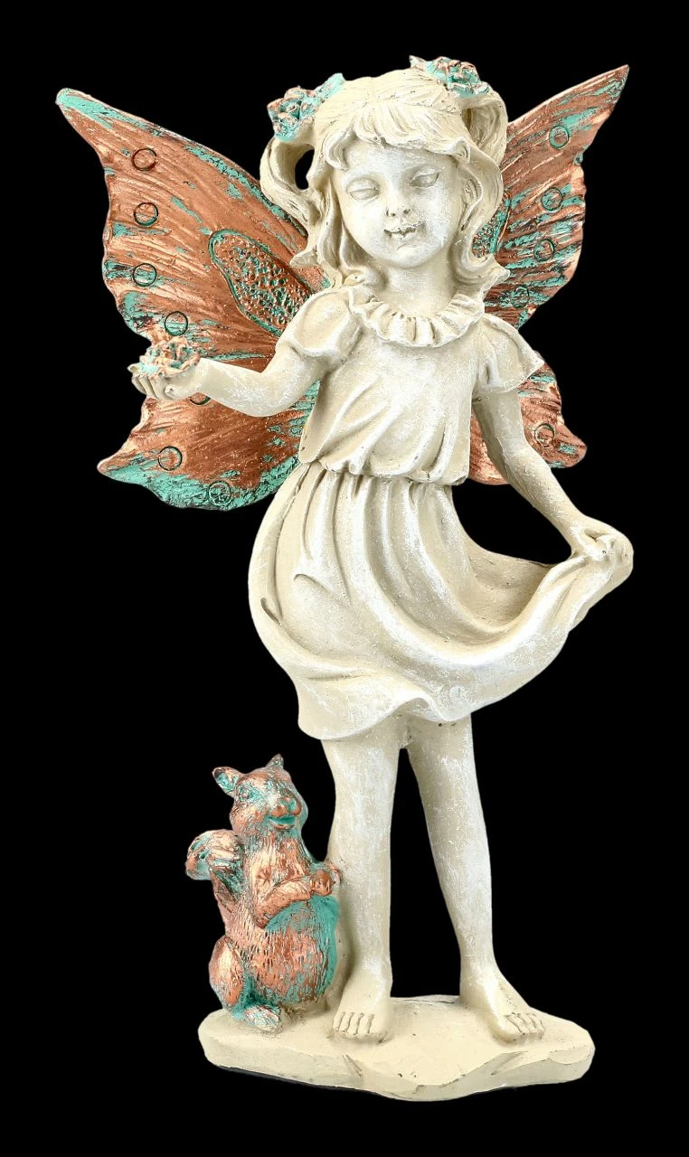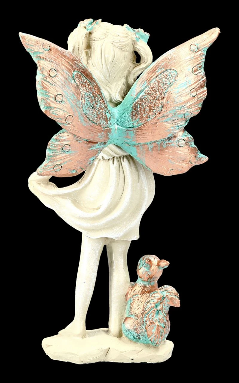 Diese süße zarte Waldelfe freut sich, gemeinsam mit ihrem Eichhörnchen, auf einen schönen Platz mitten in Ihrer Herbstdeko oder zwischen grünen Pflanzen auf der Fensterbank. Die herbstblätterfarbenen Flügel mit den grünen Akzenten und die Blüte in ihrer Hand haben dieselbe Farbe wie das Eichhörnchen. Diese süße Elfe ist 18,0 cm hoch, 12,0 cm breit, 6,0 cm tief und aus handbemaltem Kunststein (Polyresin).