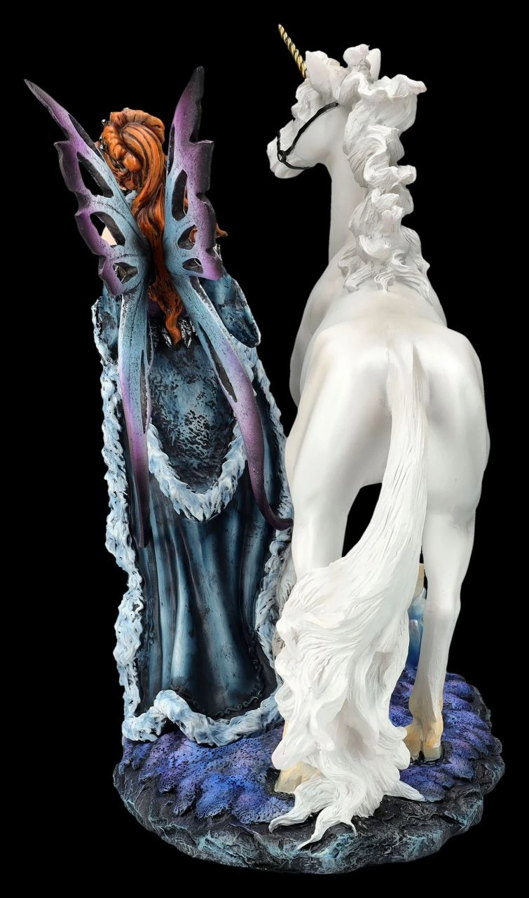 Selbst im weit entfernten, geheimnisvollen Land der magischen Wesen sind Einhörner schon sehr selten geworden. Kein Wunder also, dass die schöne Elfe Maela stolz darauf ist, gemeinsam mit ihrem Einhorn bei dem großen Empfang im Märchenschloss zu erscheinen. Begleitet und beschützt werden die beiden von dem großen grauen Wolf. Die wunderbare Elfen-Figur mit dem Einhorn und dem Wolf ist bis zu Maelas königlich prachtvollem Gewand und den großen, filigranen Flügeln, die zum Stecken sind, sehr detailreich aus liebevoll handbemaltem Kunststein (Polyresin) entstanden. Sie ist 27 cm hoch, 22 cm breit und 14,5 cm tief und für alle, die sich gerne in die magische Welt der Elfen, Feen, Drachen und Einhörner träumen, ein wirklich zauberhaftes Geschenk.
