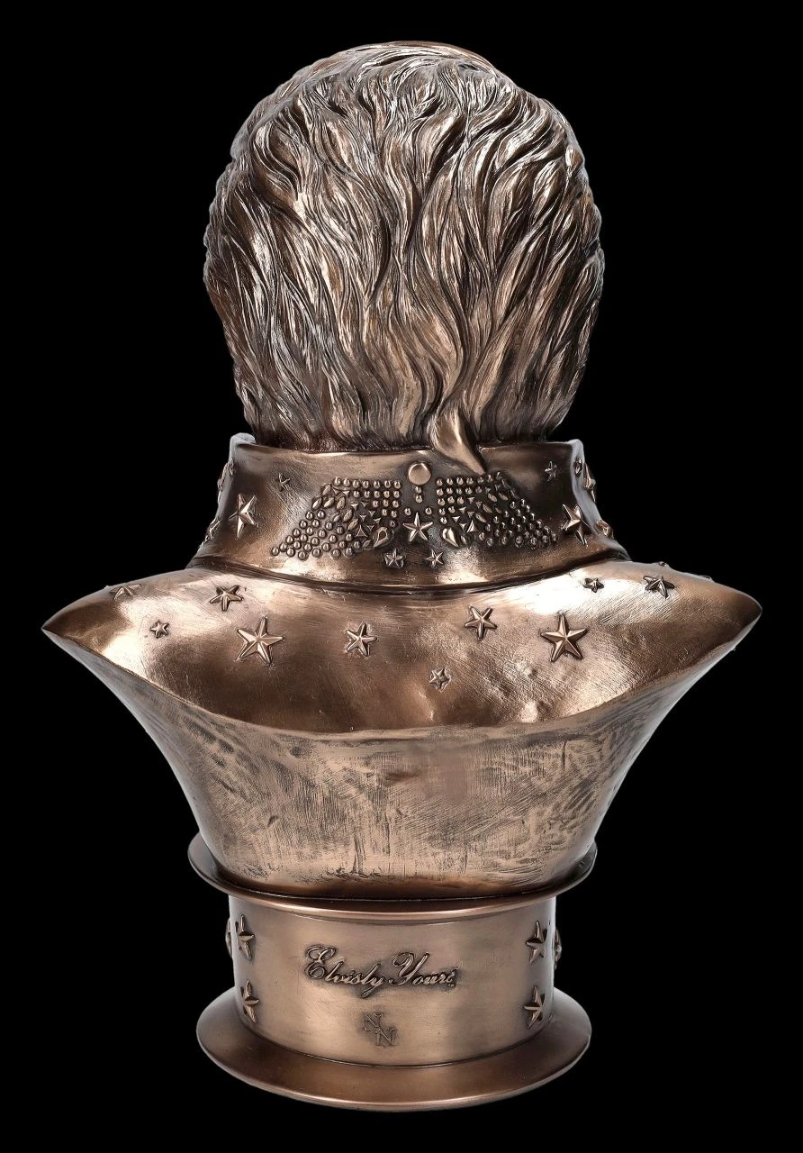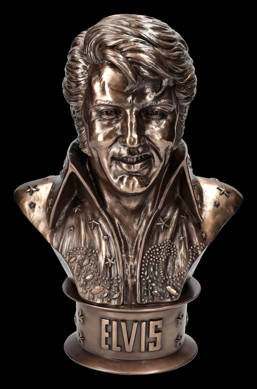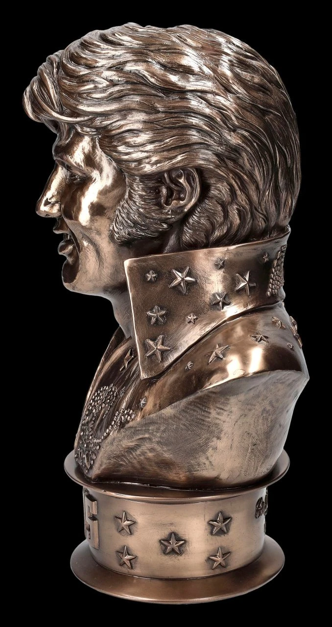 Nur 42 Jahre alt ist er geworden, als er am 16. August 1977 in Memphis starb und seine Grab ist bis heute eine wahre Kultstätte, obwohl manche Fans nicht an seinen Tod glaubten und viele Mythen ihn bis heute leben lassen. Elvis The King! Am 8. Januar 1935 geboren, hat seine Musik bis heute seine Fans und in Gedanken sehen wir ihn immer noch mit seinem kleinen Lächeln in den Mundwinkeln und dem berühmten Hüftschwung. Und sein Lächeln ist bei dieser fantastischen, edel bronzierten Elvis Presley Büste aus Kunststein (Polyresin) wunderbar dargestellt. Die 33 cm hohe, 22 cm breite und 15 cm tiefe Elvis Presley Büste ist ein toller Blickfang und ein perfektes Geschenk für jeden Fan.