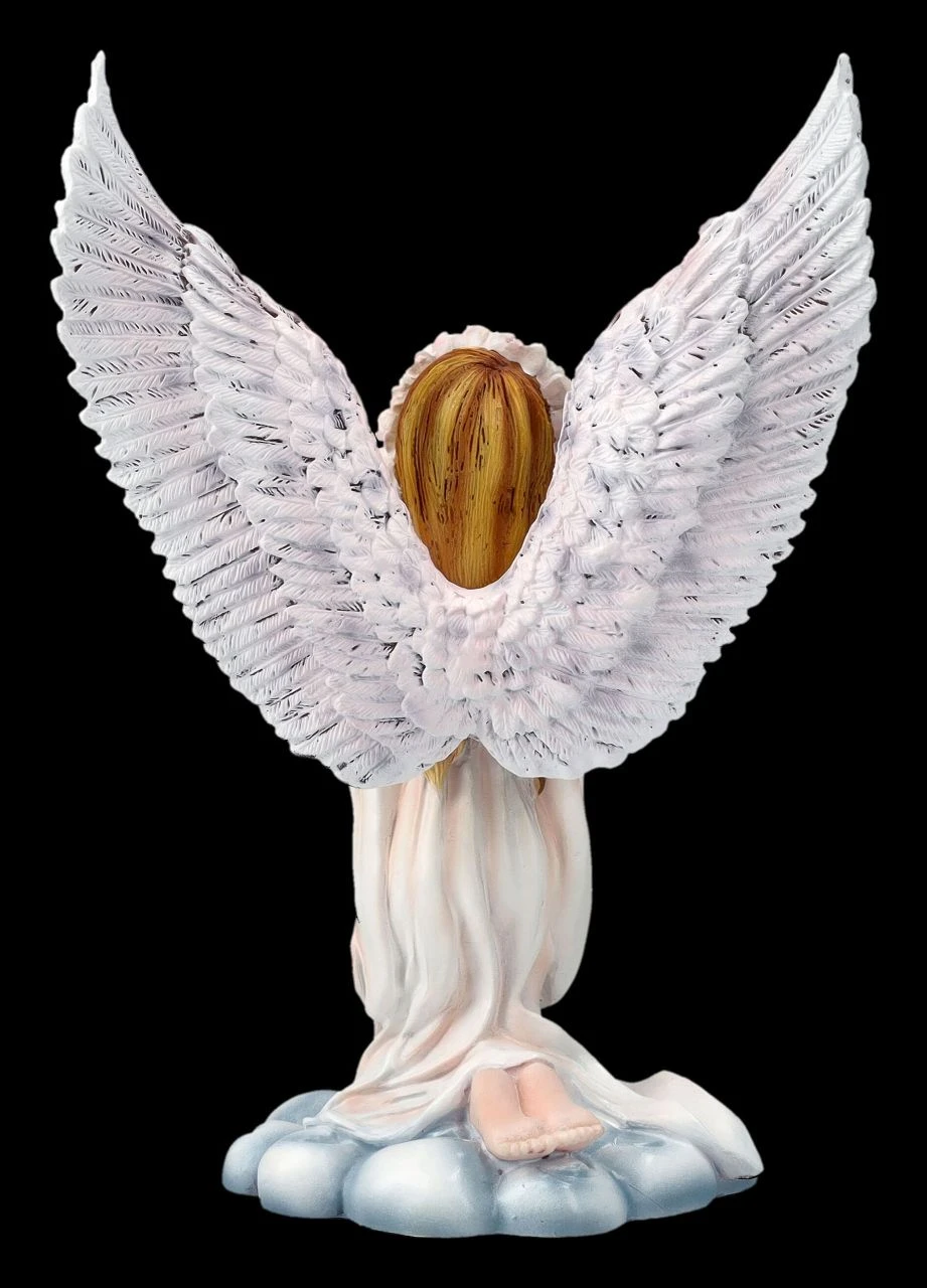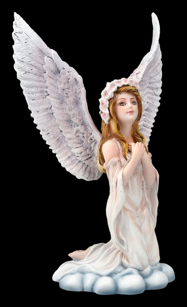 Bellerose heißt dieser wunderbar zarte Schutzengel, der in von der Morgen- oder Abendsonne bestrahlt, in seinem zartrosa Kleid auf einer kleinen weiß-blauen Wolke kniet. Auf dem nach oben gerichteten Haupt trägt Bellerose einen Kranz aus zart rosafarbenen Rosen. Der niedliche Engel mit dem süßen Gesicht ist bis zu den großen Flügeln detailreich aus liebevoll handbemaltem Kunststein (Polyresin) gefertigt. Die niedliche Engel Figur ist 16,5 cm hoch, 11,5 cm breit und 7,5 cm tief und die großen Flügel sind zum Stecken. Jeder, der sich seinen Schutzengel vorstellen möchte, wird sich über Bellerose als Geschenk sicher sehr freuen.