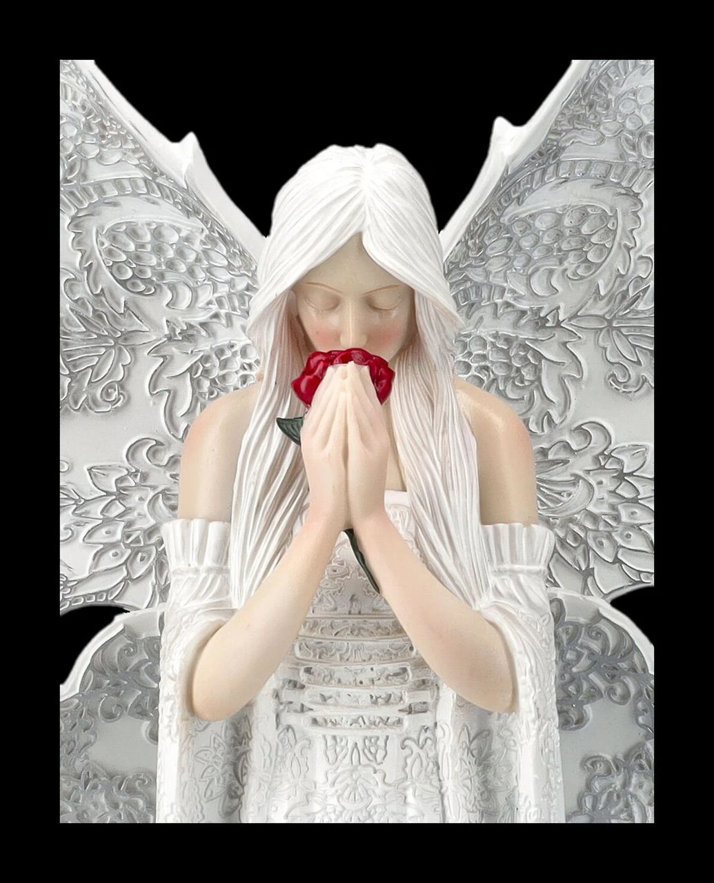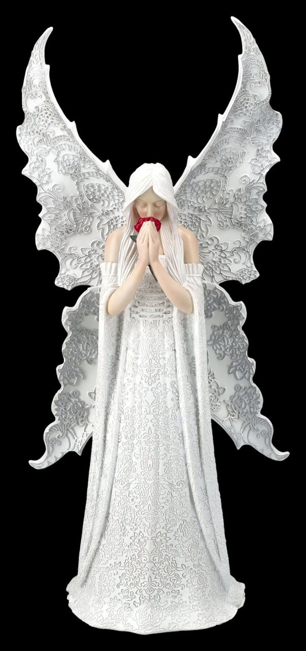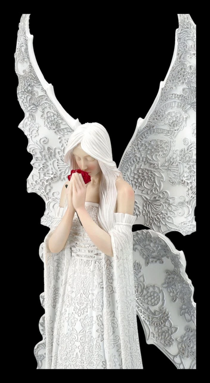 ‚Only Love Remains‘ nennt die berühmte Künstlerin Anne Stokes ihren wunderschönen weißen Engel, der sich trauernd über die rote Rose in seinen Händen beugt. Doch Engel behüten auch schöne Erinnerungen und zeigen, dass sie mit ihrer Liebe immer für einen da sind. Der beeindruckend schöne Engel mit den großen Flügeln ist mit viel Liebe zum Detail kunstvoll gearbeitet und sehr zart von Hand bemalt. Er ist 35 cm hoch, 16,5 cm breit und 11,5 cm tief und als Zeichen der Liebe oder auch zum Trost ein wunderbares Geschenk und kommt inklusive eines schön bedruckten Geschenkkartons.