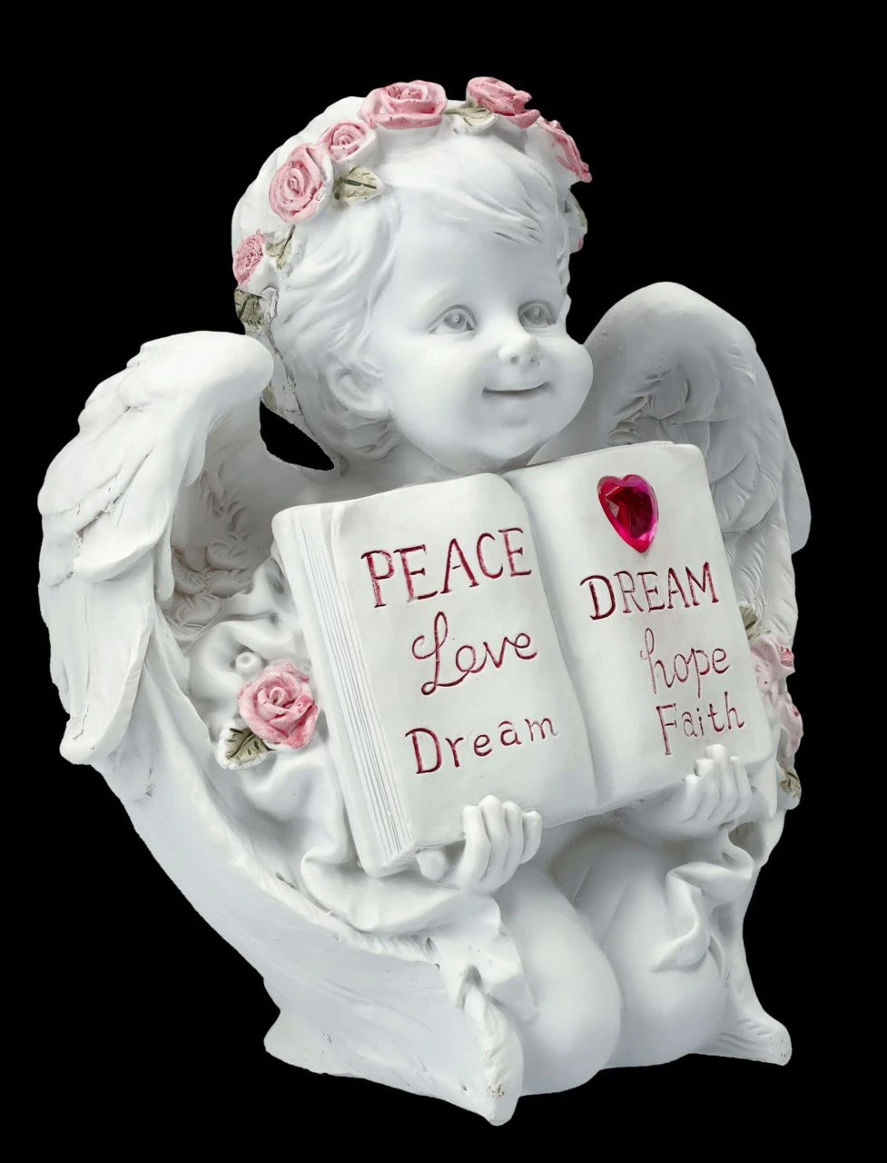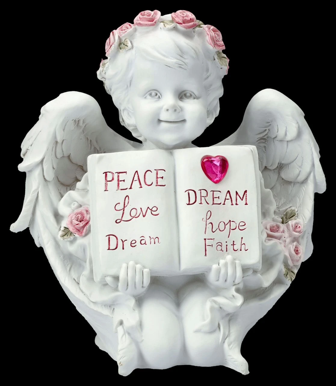 Ob mit Flügeln oder ohne – die niedlichen kleinen Putten kennt man bereits seit der Antike. Oft wurden sie als Liebesengel dargestellt, wie auch bei dieser niedlichen Engel-Figur, die mit rosa Rosen bekränzt lächelnd am Boden kniet und ein aufgeschlagenes Buch, bei dem die Worte ‚Peace, Love, Dream‘, also ‚Friede, Liebe, Traum‘ auf der einen Seite und unter einem roten Herzen ‚Dream, Hope, Faith‘, also ‚Traum, Hoffnung, Glaube‘ auf der anderen Seite steht. Die bezaubernde Engel-Figur ist aus liebevoll handbemaltem Kunststein (Polyresin) und 15,5 cm hoch, 14 cm breit und 8 cm tief. Die Putte mit Buch und Herz ist sicherlich auch ein liebevolles Geschenk, das jedem ein Lächeln entlocken wird.