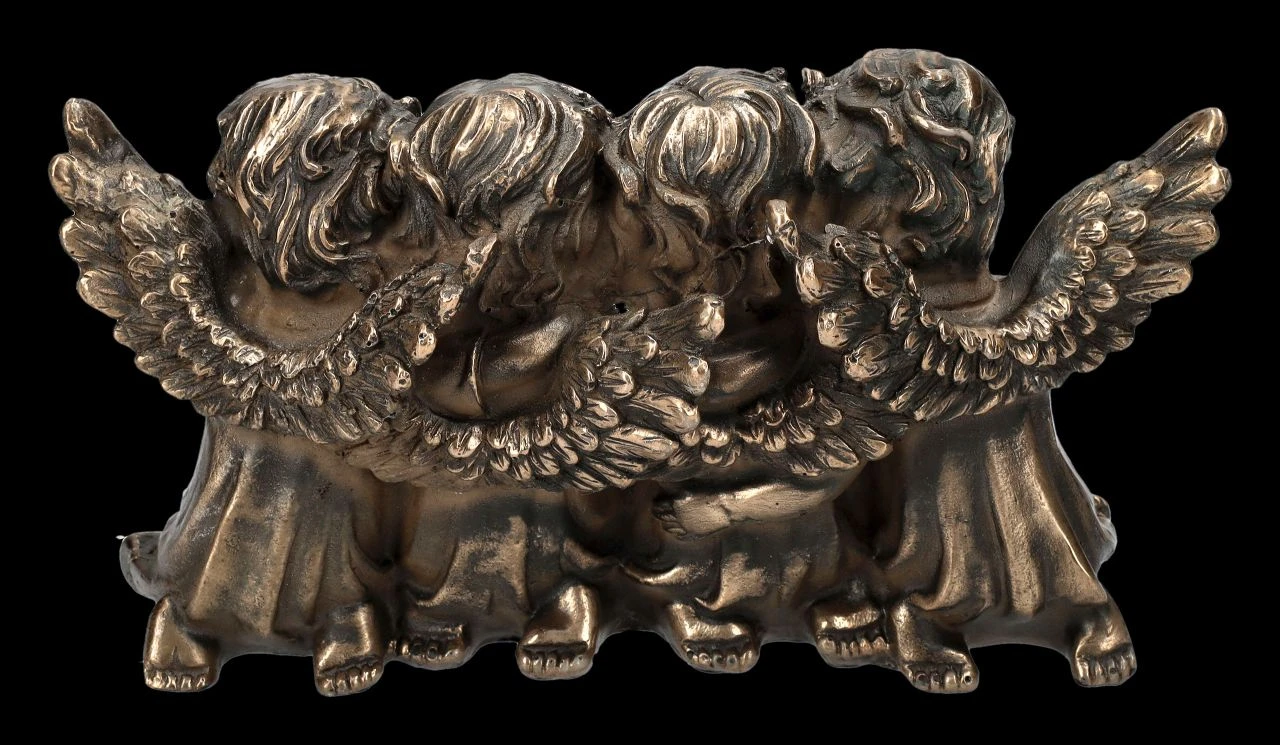 Völlig fasziniert schauen die vier kleinen Engel in das große Buch, aus dem die beiden Engel in der Mitte abwechselnd vorlesen. Die Engel Figur mit den in einem Buch lesenden niedlichen Putten ist 8,5 cm hoch, 17 cm breit und 6,5 cm tief. Die vier Putten auf dem Buch gehören zu der großen Engelsschar in unserem Shop und wurden aus bronziertem Kunststein (Polyresin) gefertigt. Sie sind auch ein tolles Geschenk für kleine und große Leseratten.