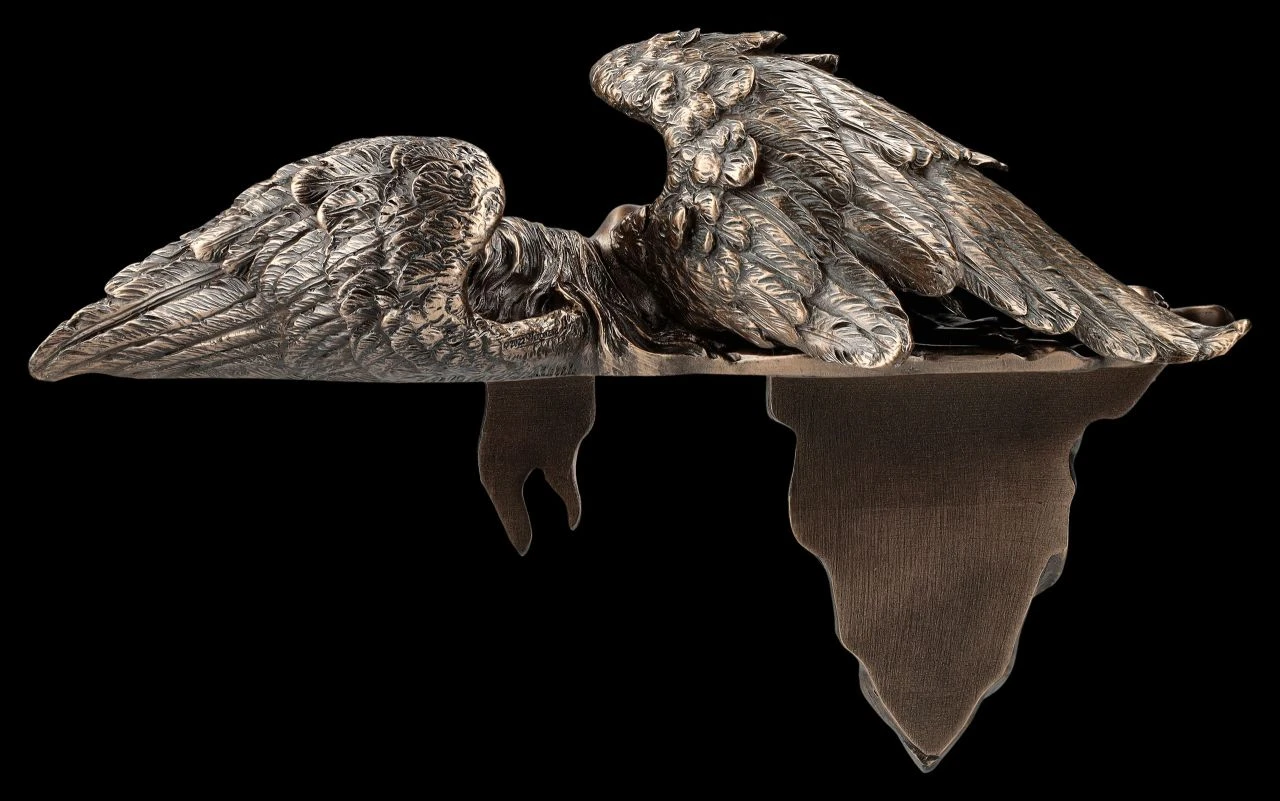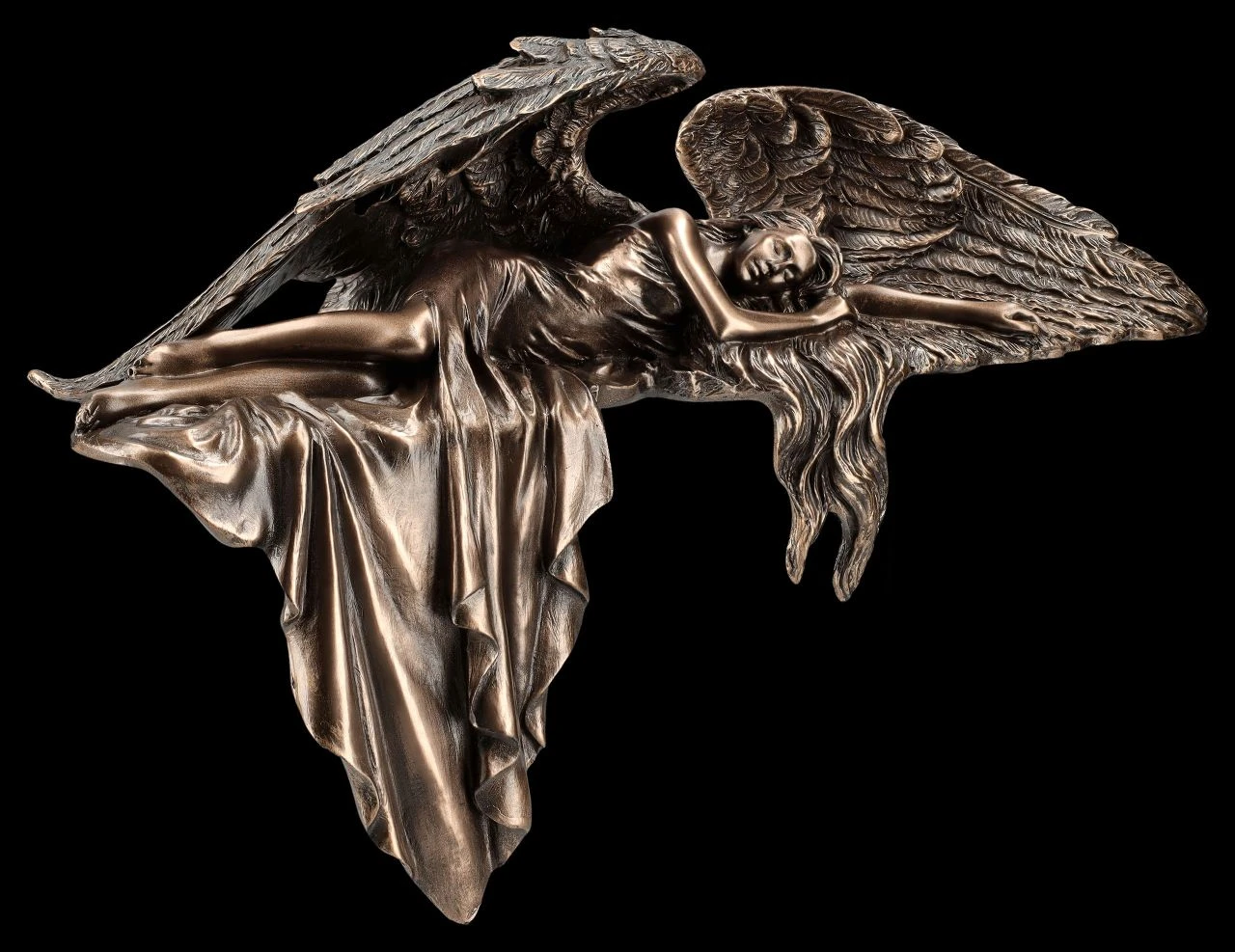 Der Flug scheint anstrengend gewesen zu sein und so hat sich der wunderschöne Schutzengel nur ganz kurz auf dem Schrank oder einem Regal hingelegt und ist dabei eingenickt. Lediglich die großen Flügel geben ihm Halt. Das lange Kleid, das den zauberhaften Engel wie ein Schleier bedeckt, hängt, wie auch das lange gewellte Haar, über die Kante. Die edel bronzierte Engel-Figur aus Kunststein (Polyresin) ist 13,5 cm hoch, 20 cm breit und 6,5 cm tief und stammt aus der Studio Collection von Veronese. Der Schutzengel als Kantenhocker ist einfach bezaubernd und hat einen wirklich guten Platz verdient, an dem er sofort entdeckt wird. Außerdem sind Schutzengel auch immer willkommene Geschenke, die viel Freude bereiten.