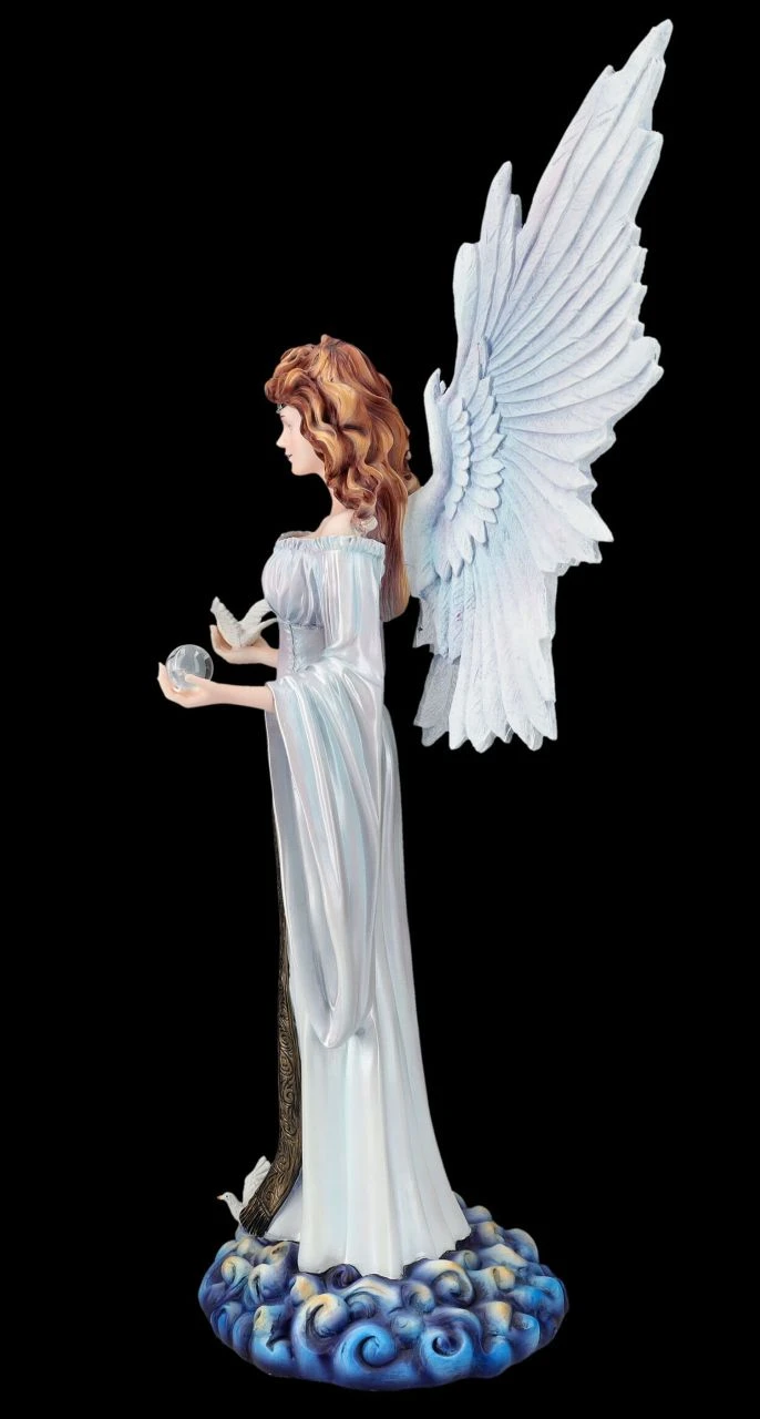Der wunderschöne Engel steht auf einem Wolkenband und lässt die Friedenstaube in seiner rechten Hand losfliegen. Zu seinen Füßen wartet bereits eine weitere Taube. In der linken Hand hält der bezaubernde Engel eine Kristallkugel. Wer möchte nicht einen liebevollen Engel an seiner Seite haben, der ihn beschützt und zwar nicht den Himmel auf Erden verspricht, aber einen kleinen Blick in die Kristallkugel auf den HImmelsfrieden werfen lässt? Die 42 cm hohe, 23 cm breite und 16 cm tiefe beeindruckende Engelsfigur mit den Tauben ist detailreich aus liebevoll handbemaltem Kunststein (Polyresin) gefertigt. Die herrlichen Flügel des schönen Engels sind zum Stecken. Für jeden dem man sagen möchte, dass ihn sein Schutzengel stets begleitet, aber auch zum Beispiel für eine Hochzeitstafel, ist dieser Engel mit den Tauben ein zauberhaftes Geschenk.